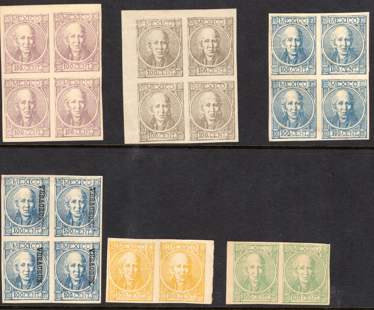 226 Proof   imageMexico. 1868 "Hidalgos". 1868 100c. Thick Figures, group of 20 trial color proofs (four blocks of four and two pairs) in Yellow, Blue, Gray and Light Brown, including one block with trial district "Veracruz" overprint. Very attractive and colorful, showing margins all around except for one pair at top. Scott 64v. (Image)