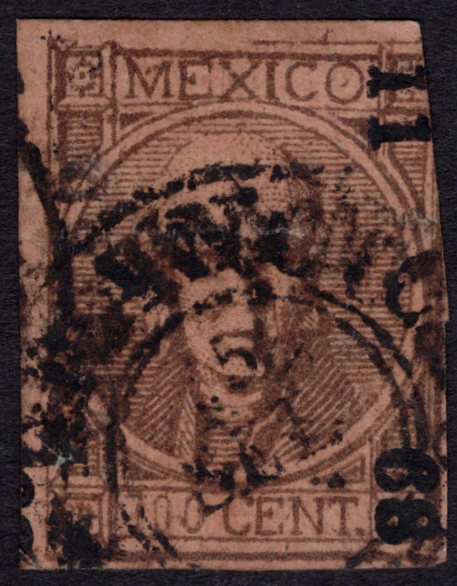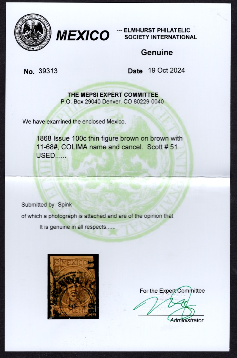 227 Used   imageMexico. 1868 "Hidalgos". Colima1868, 100c. Brown on Brown, thin figures, imperforate, consignment 11-1868 used at Colima. Very scarce in this color. 2024 MEPSI certificate. Scott 51; NF $400. (Image) (Image2) (All Images)