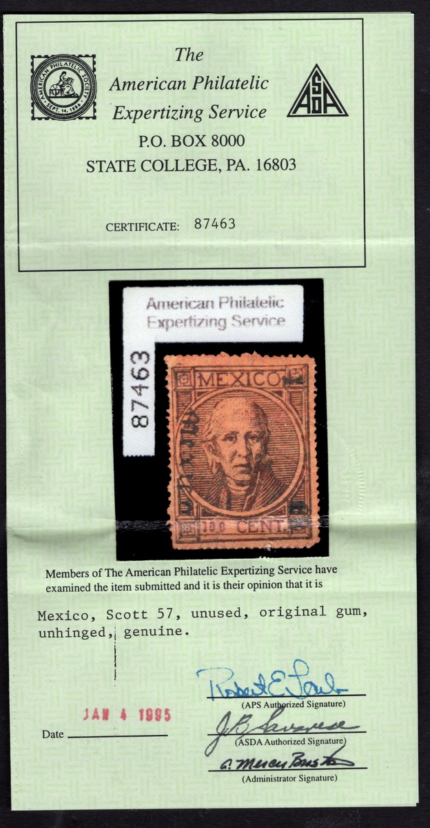 228   imageMexico. 1868 "Hidalgos". Mexico District 100c. Brown on Brown Thin Figures (#1-68), perforate and mint n.h., well centered. 1995 APS certificate. Scott 57, $1,000. (Image) (Image2) (All Images)