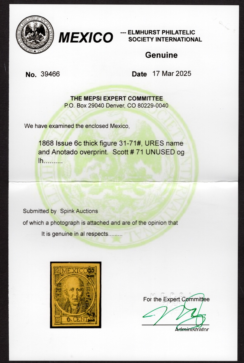 229   imageMexico. 1868 "Hidalgos". Ures 6c. Brown (#31-71), Thick Figures, an unused example with Anotado overprint, good margins with lightly hinged o.g. 1995 APS and 2025 MEPSI certificates. Scott 71, $650. (Image) (Image2) (All Images)