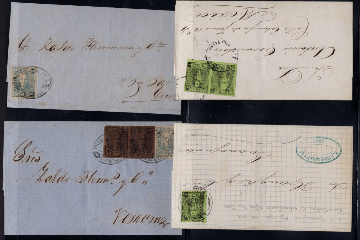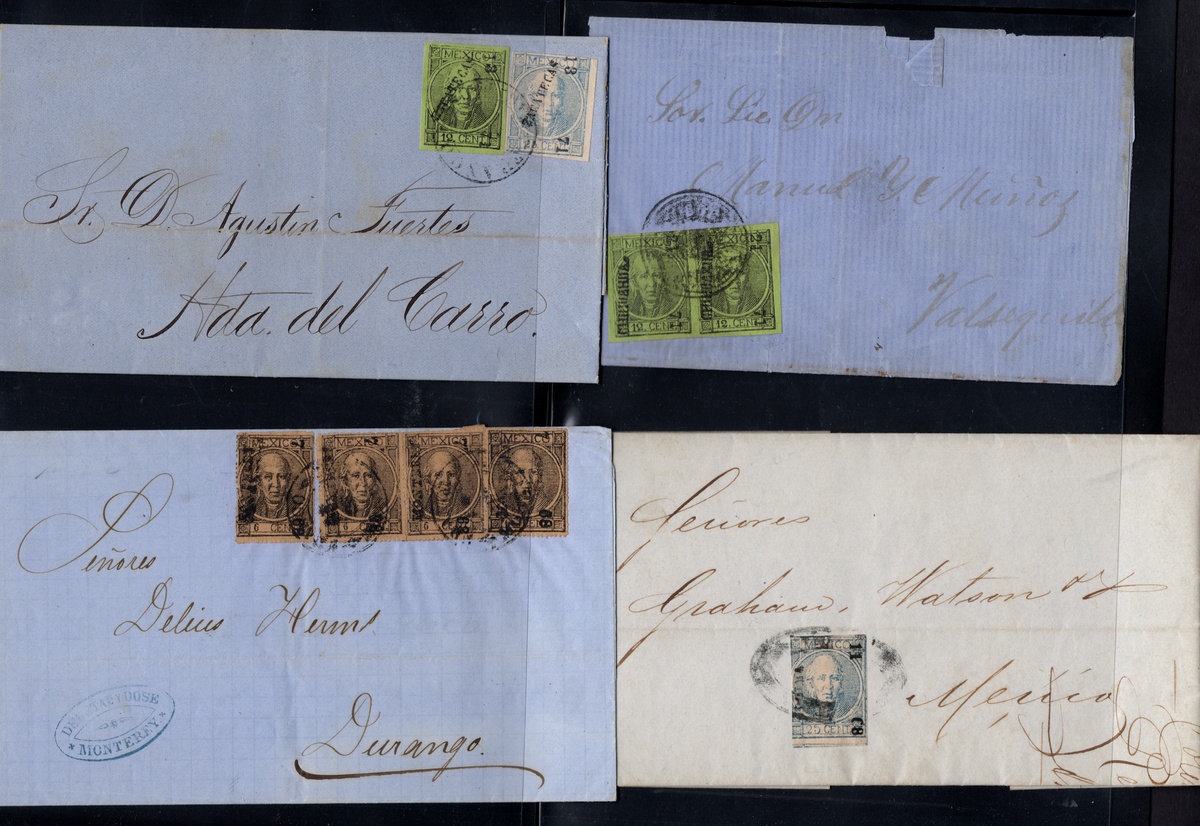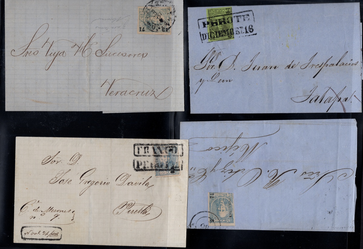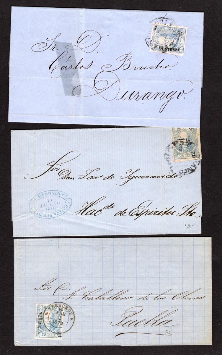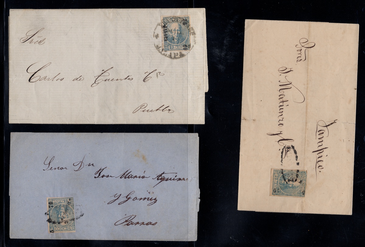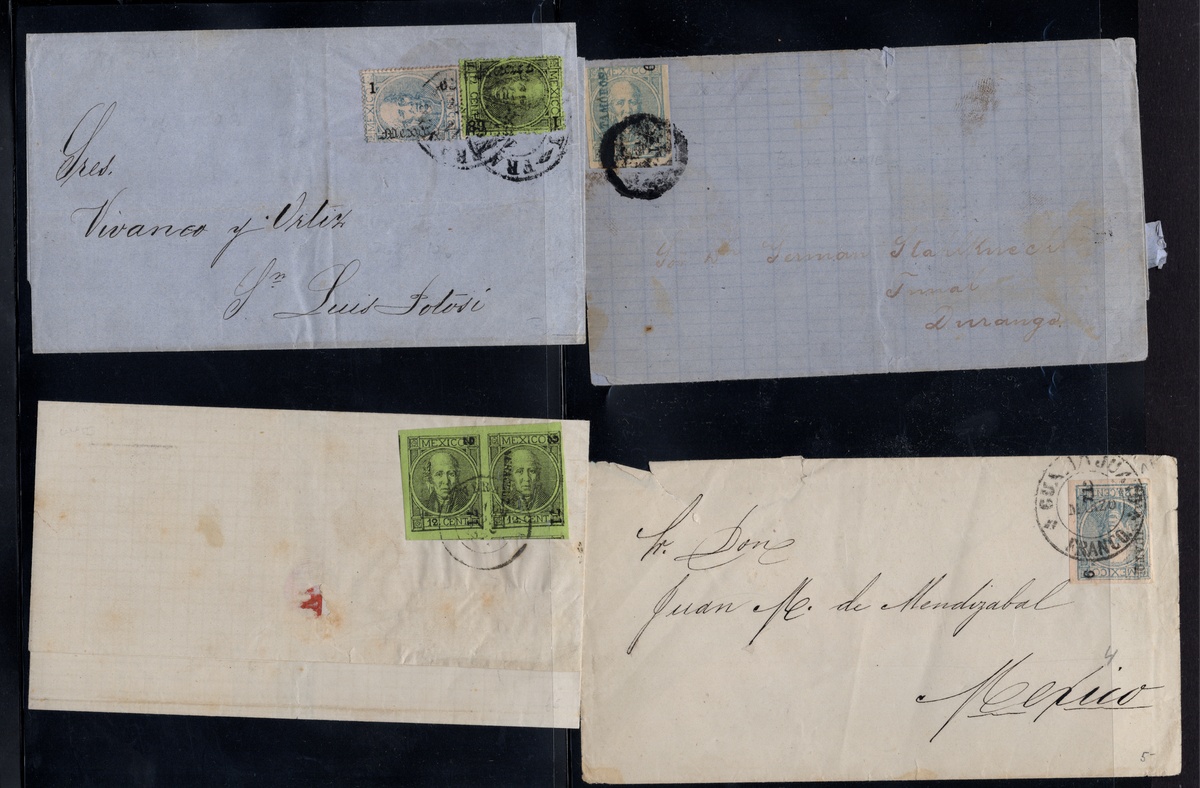 230   imageMexico. 1868 "Hidalgos". Various Districts Group of 24 covers in good condition (except one with tape on front), Four Thin FIgures from Monterrey, Jalapa and Mexico, Remaining twenty covers are Thick FIgures from Jalapa, San Luis Potosí, Guadalajara-Tepic, Pachuca, Papantla, Guanajuato, Zacatecas, Veracruz, Matamoros , Monterrey, Mexico and Chihuahua. Several with perforated stamps. Scott 48, 52-54, 58-61. (Image) (Image2) (Image3) (Image4) (Image5) (Image6) (Image7) (All Images)