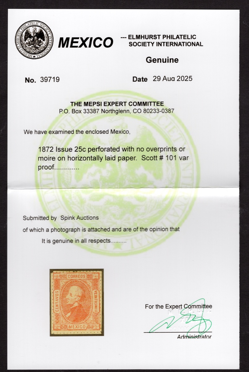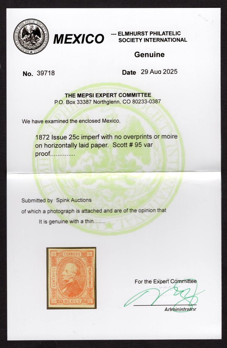 233 Proof   imageMexico. 1872 "Hidalgos". No moiré Laid Paper Proof 25c. Red perforate Proof without moiré on horizontally laid paper, a well margined example. Small thin spot. 2025 MEPSI certificate. Scott 101 var. (Image) (Image2) (All Images)