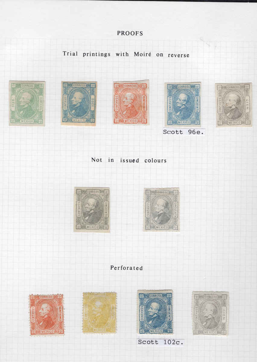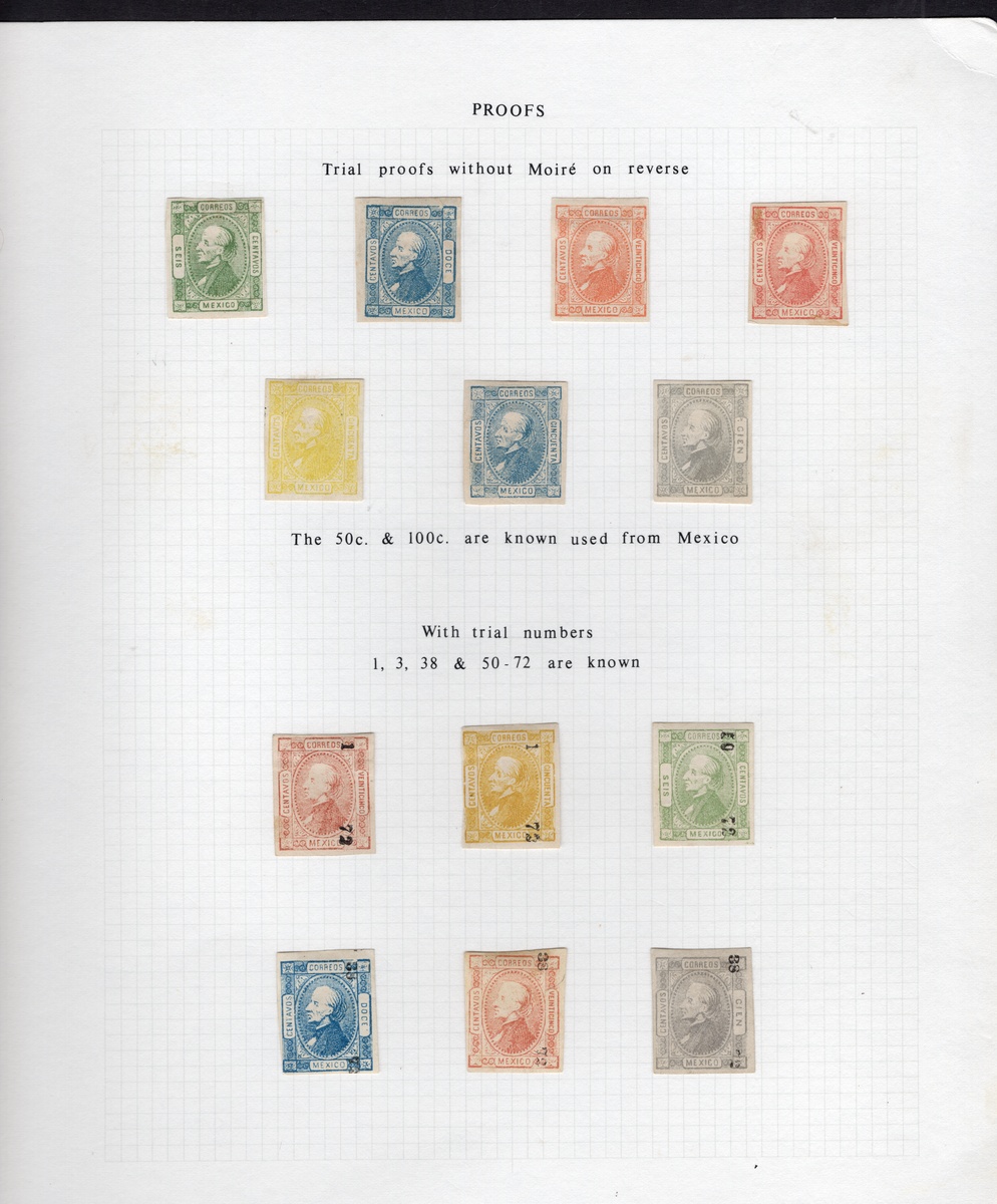 234 Proof   imageMexico. 1872 "Hidalgos". Proofs and Trial Proof Group of 24 proofs, 6c. green–100c. gray, including trial proofs with and without moiré on the reverse, without consignment numbers or overprints; and the same with trial consignment numbers, two 50c. in a different color than issued (gray), and trial perforations. Scott 93 var- 97 var, 98 var. (Image) (Image2) (All Images)