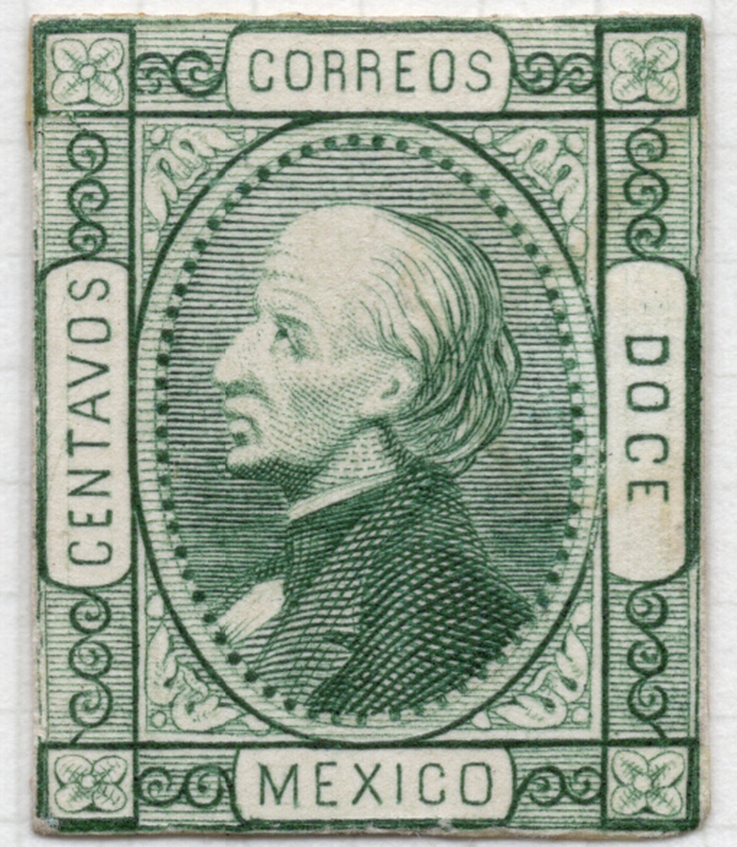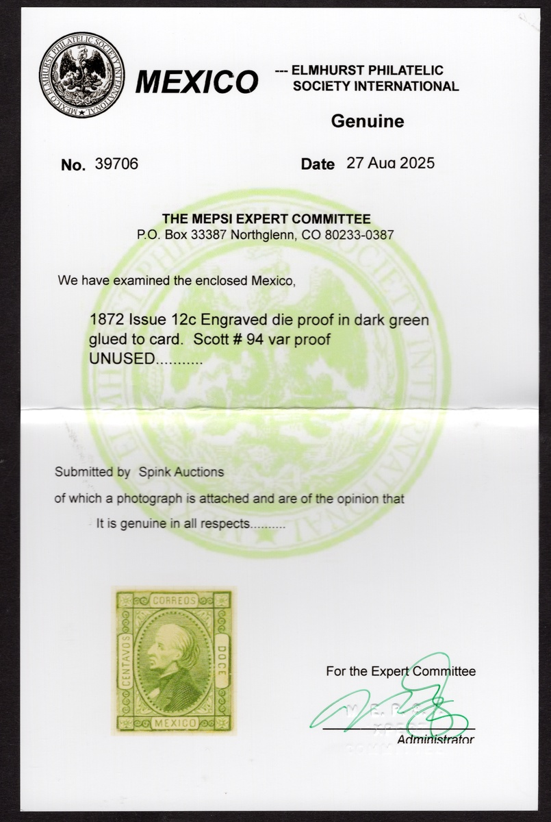 235 Proof   imageMexico. 1872 "Hidalgos". Die Proofs 12c. Green engraved and glued to card, complete margins. An extraordinarily rare proof. 2025 MEPSI certificate. Scott 94 var. (Image) (Image2) (All Images)