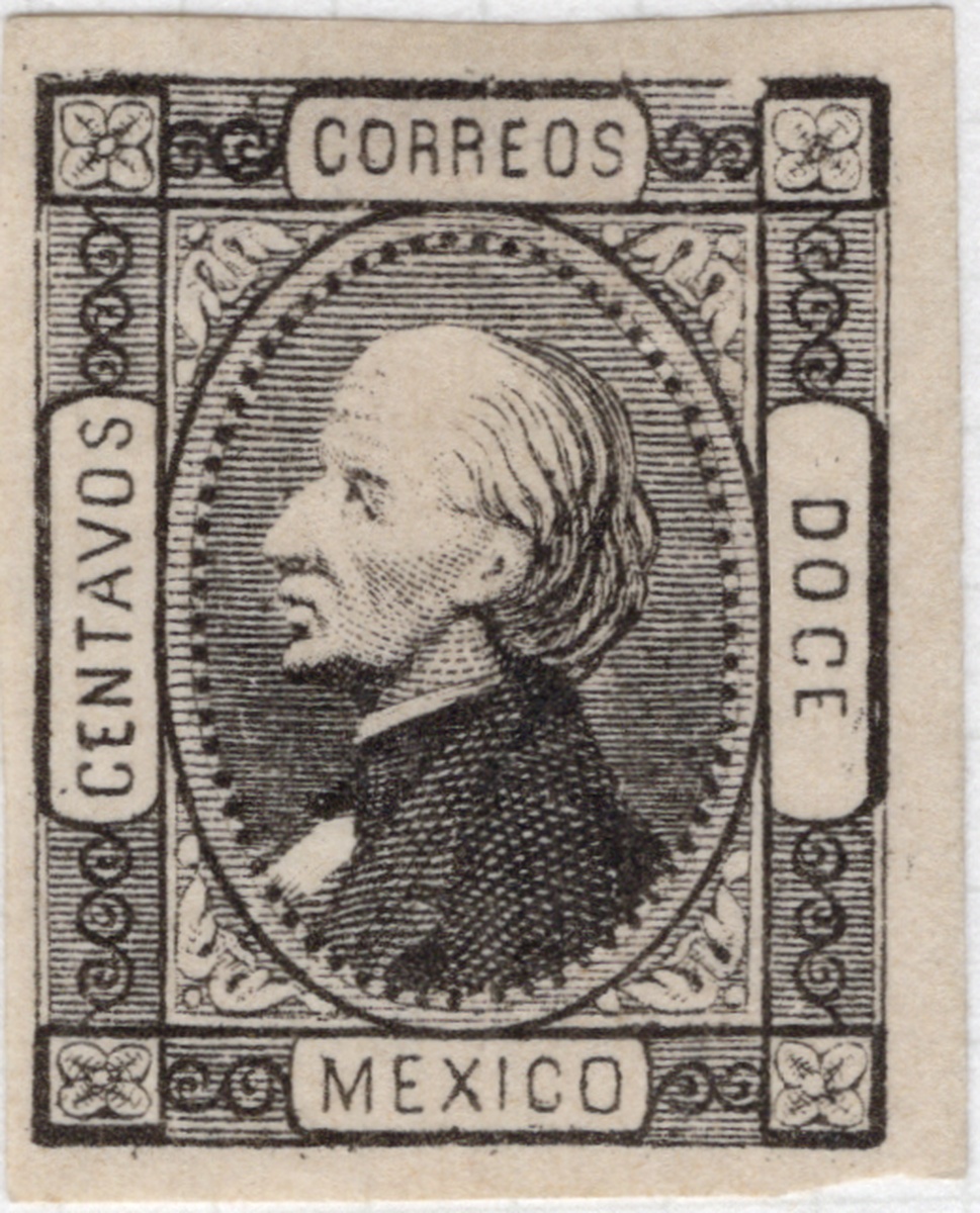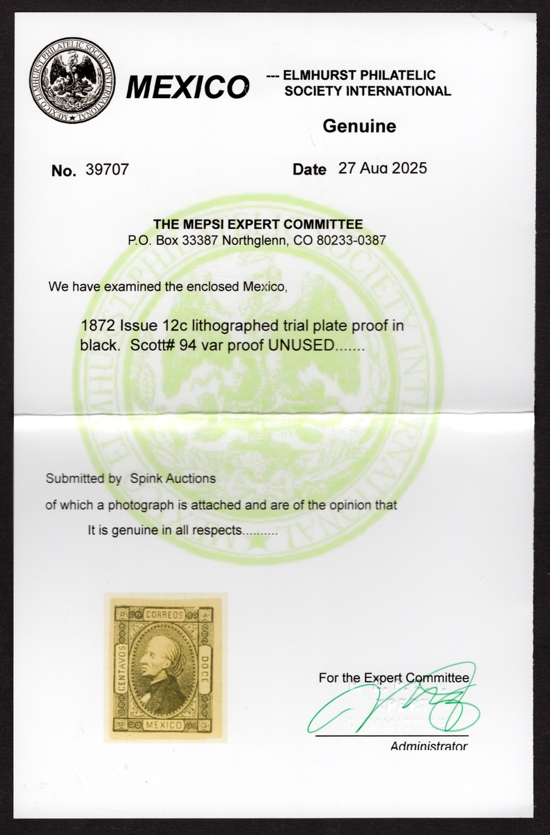 236 Proof   imageMexico. 1872 "Hidalgos". Trial Plate Proof 12c. Black lithographed on white wove paper, four ample margins. Thin spot not detracting from this extraordinarily rare proof. 2025 MEPSI certificate. Scott 94 var. (Image) (Image2) (All Images)