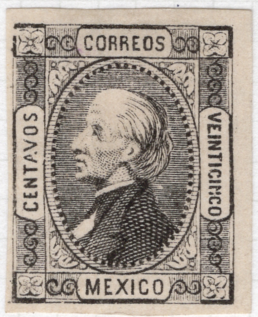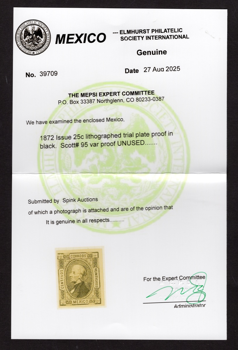 237 Proof   imageMexico. 1872 "Hidalgos". Trial Plate Proof 25c. Black lithographed on white wove paper, four good margins in this very desirable and extraordinarily rare item. 2025 MEPSI certificate. Scott 95 var. (Image) (Image2) (All Images)