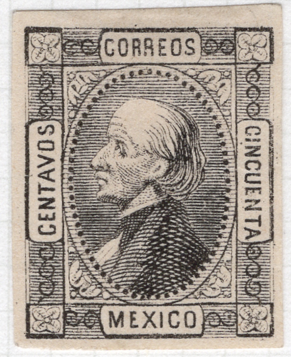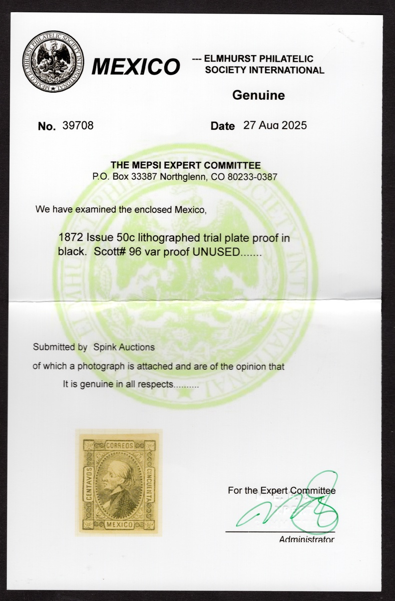 239 Proof   imageMexico. 1872 "Hidalgos". Trial Plate Proof 50c. Black lithographed on white wove paper, well margined. An extraordinarily rare proof. 2025 MEPSI certificate. Scott 96 var. (Image) (Image2) (All Images)