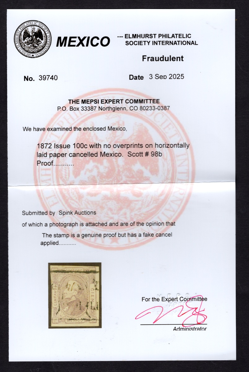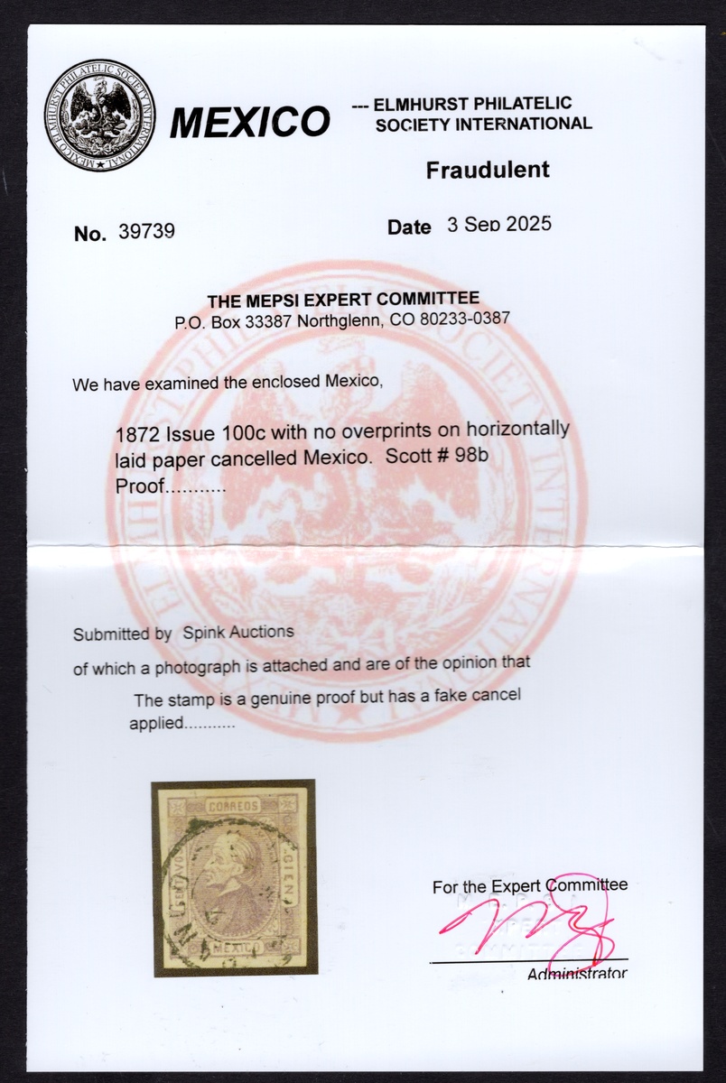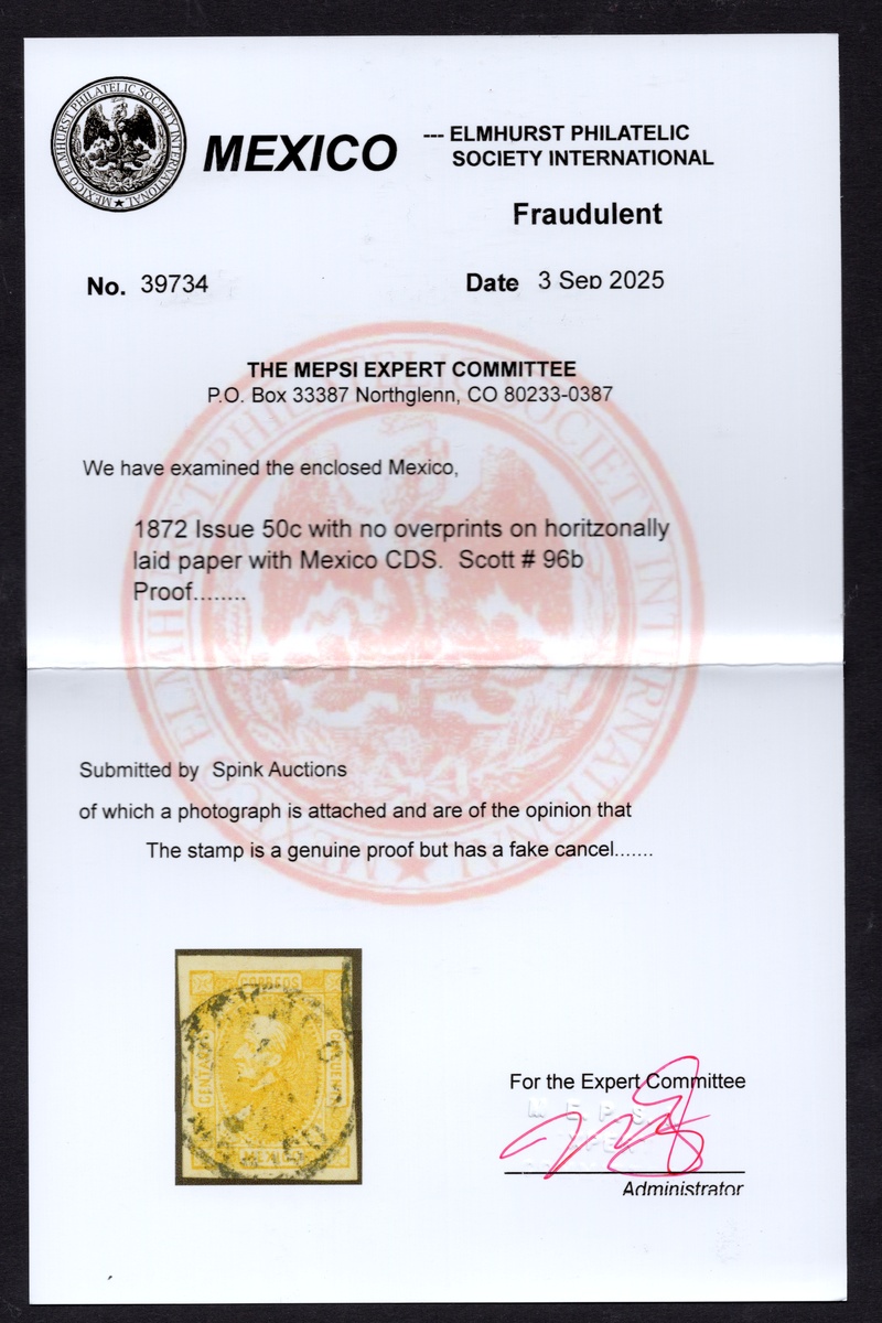 240 Proof   imageMexico. 1872 "Hidalgos". Trial Proof Trio including one 50c. Yellow and two 100c. Gray genuine trial proofs with no moiré, no consignment number or overprint, each with a fake cancel. All with good to excellent margins all around, one 100c. almost touching at left. The other 100c. has small thin in bottom margin. 2025 MEPSI certificates. Scott 96b var, 98b var. (Image) (Image2) (Image3) (Image4) (All Images)
