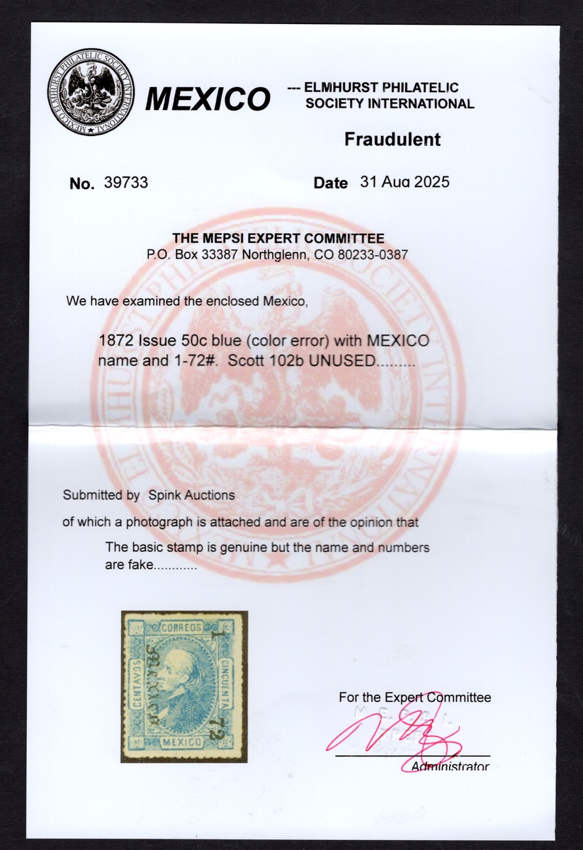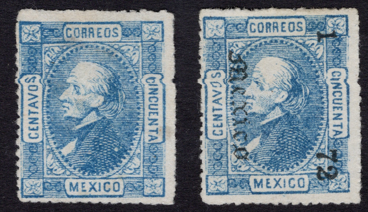 241   imageMexico. 1872 "Hidalgos". Unoverprinted Group of two 50c. Blue error of color for Yellow, unused, perforated stamps. One has the rare "Papel Sellado" watermark, tight margins but clear at left and bottom. The other is a genuine unwatermarked unoverprinted stamp with an added fake overprint and consignment numbers Mexico (#1-72). 2025 MEPSI certificates. Scott 90b, 102c, $245. (Image) (Image2) (Image3) (All Images)