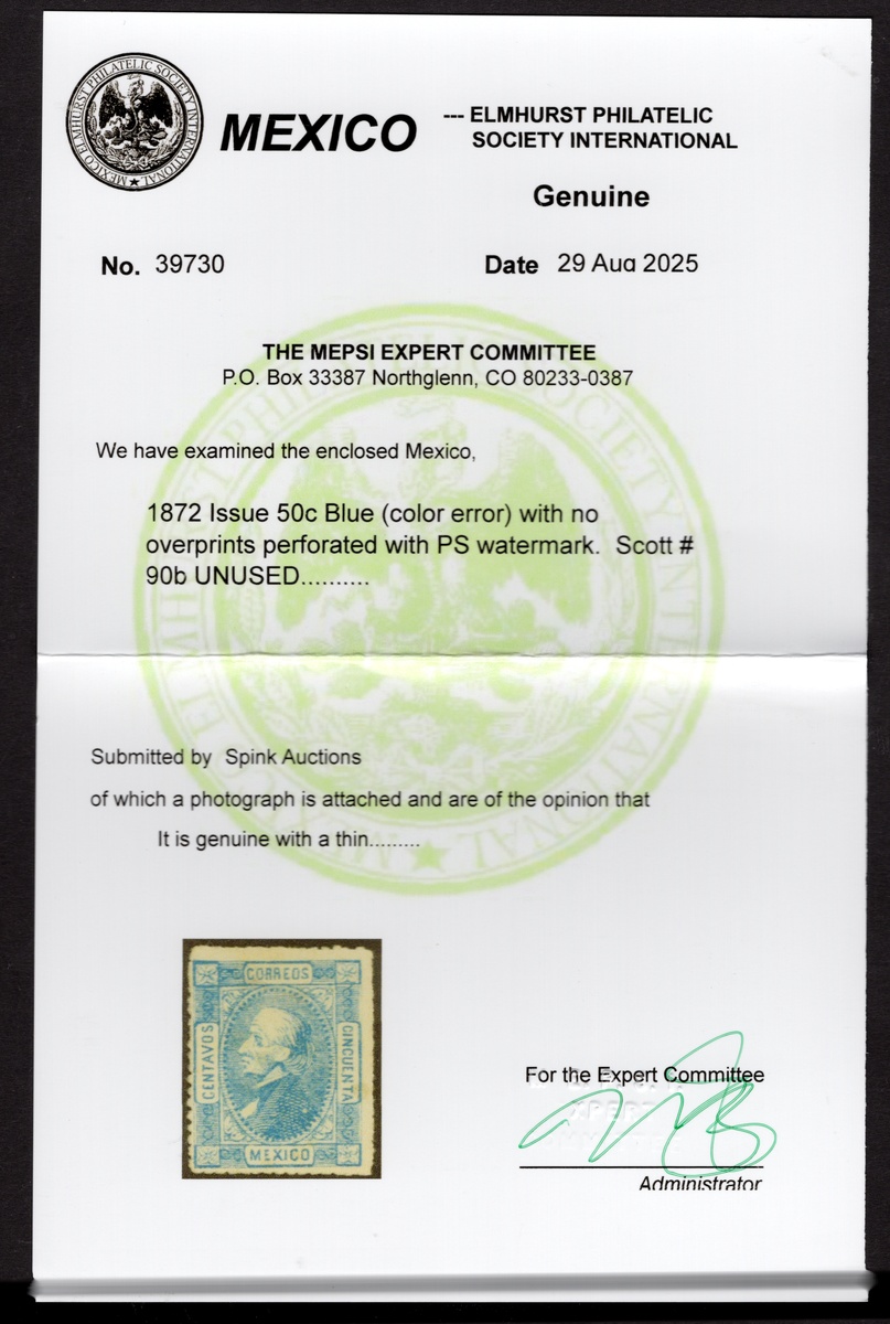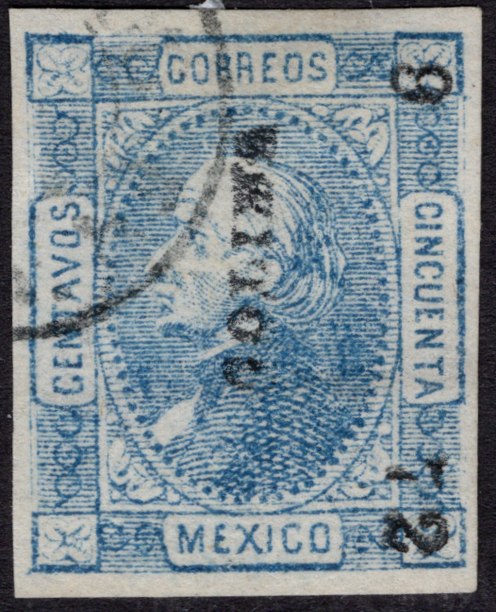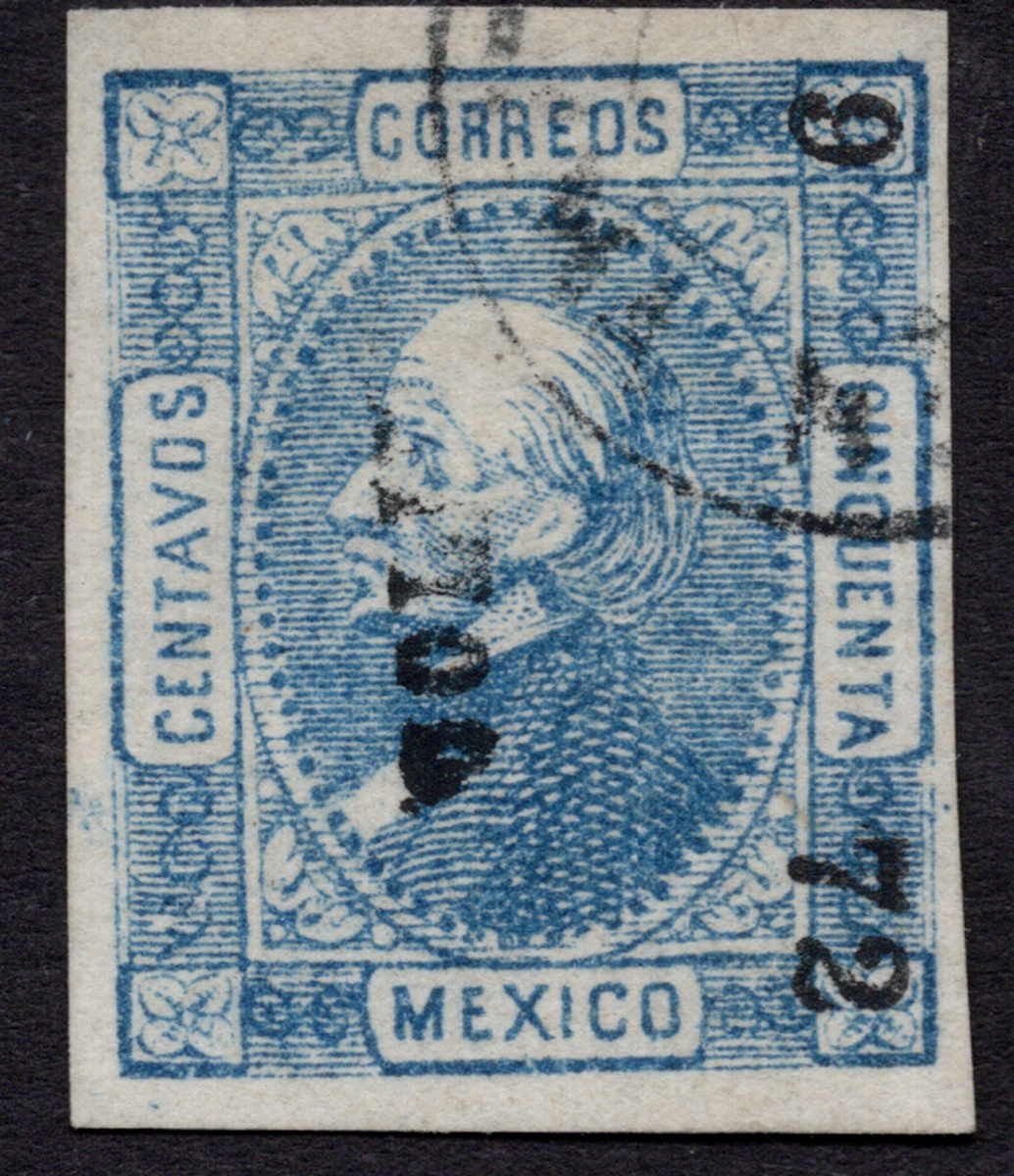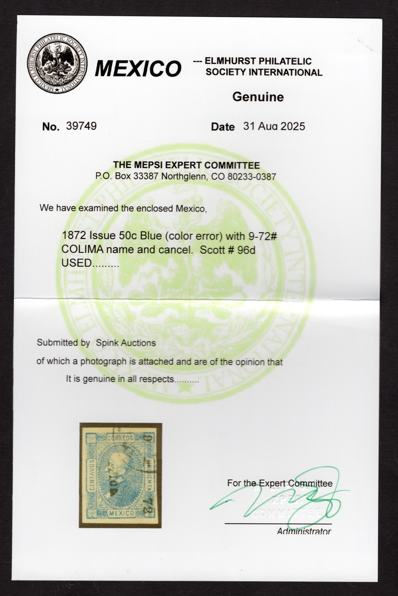 255 Used   imageMexico. 1872 "Hidalgos". Colima 50c. Blue instead of Yellow (#9-72), error of color, used with circular Colima h.s. Signed Aguirre, 2025 MEPSI certificate. Scott 96d, $650.. (Image)