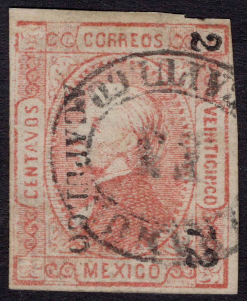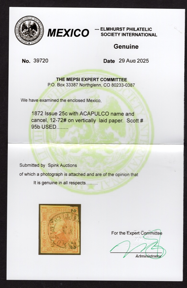 242 Used   imageMexico. 1872 "Hidalgos". Acapulco 25c. Red (#12-72) on vertically laid paper, used, complete margins all around. 2025 MEPSI certificate. Scott 95b, $500. (Image) (Image2) (All Images)