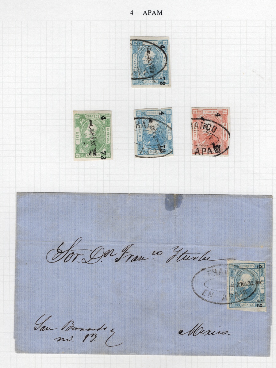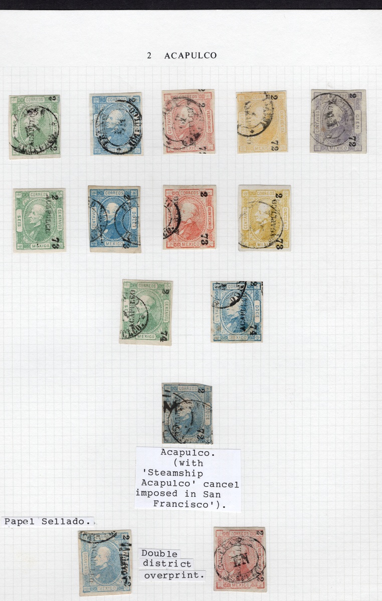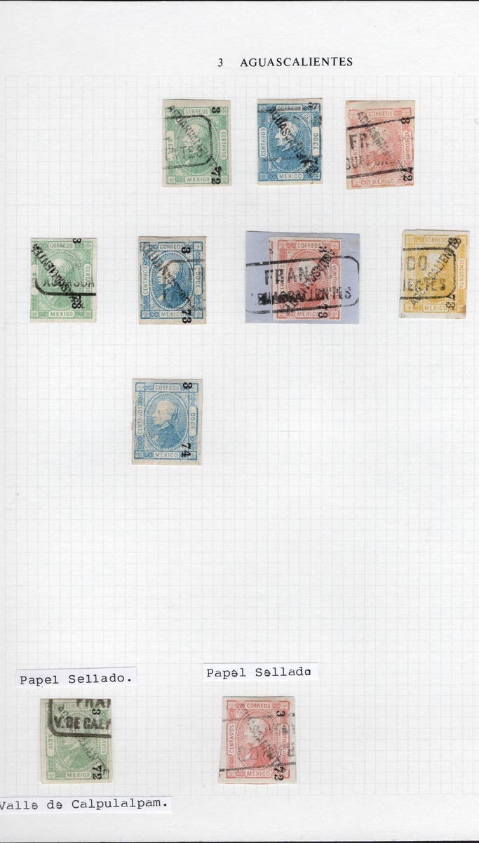 243 Used   imageMexico. 1872 "Hidalgos". Acapulco, Aguascalientes, Apam Group of 28 used and unused stamps, and one Apam cover with 12c. blue, perforated. The stamps are otherwise imperforate, neatly mounted on presentation pages (consignments #2, 3, and 4) with different consignment years 1872–74, each in a row, with no duplication. The group includes denominations from 6c. to 100c. for Acapulco, 6c. to 50c. for Aguascalientes, and 6c. to 25c. for Apam, as well as four stamps with "Papel Sellado" watermark. Cancels include Acapulco, Steamship Acapulco, Aguascalientes, Calpulalpam, and Apam. Displaying very fine condition, many with three or four clear margins. Scott 81-83, 93-96, 98,100; NF and Scott (for watermarked stamps) is $ 1,268 for stamps off cover., , (Image) (Image2) (Image3) (All Images)
