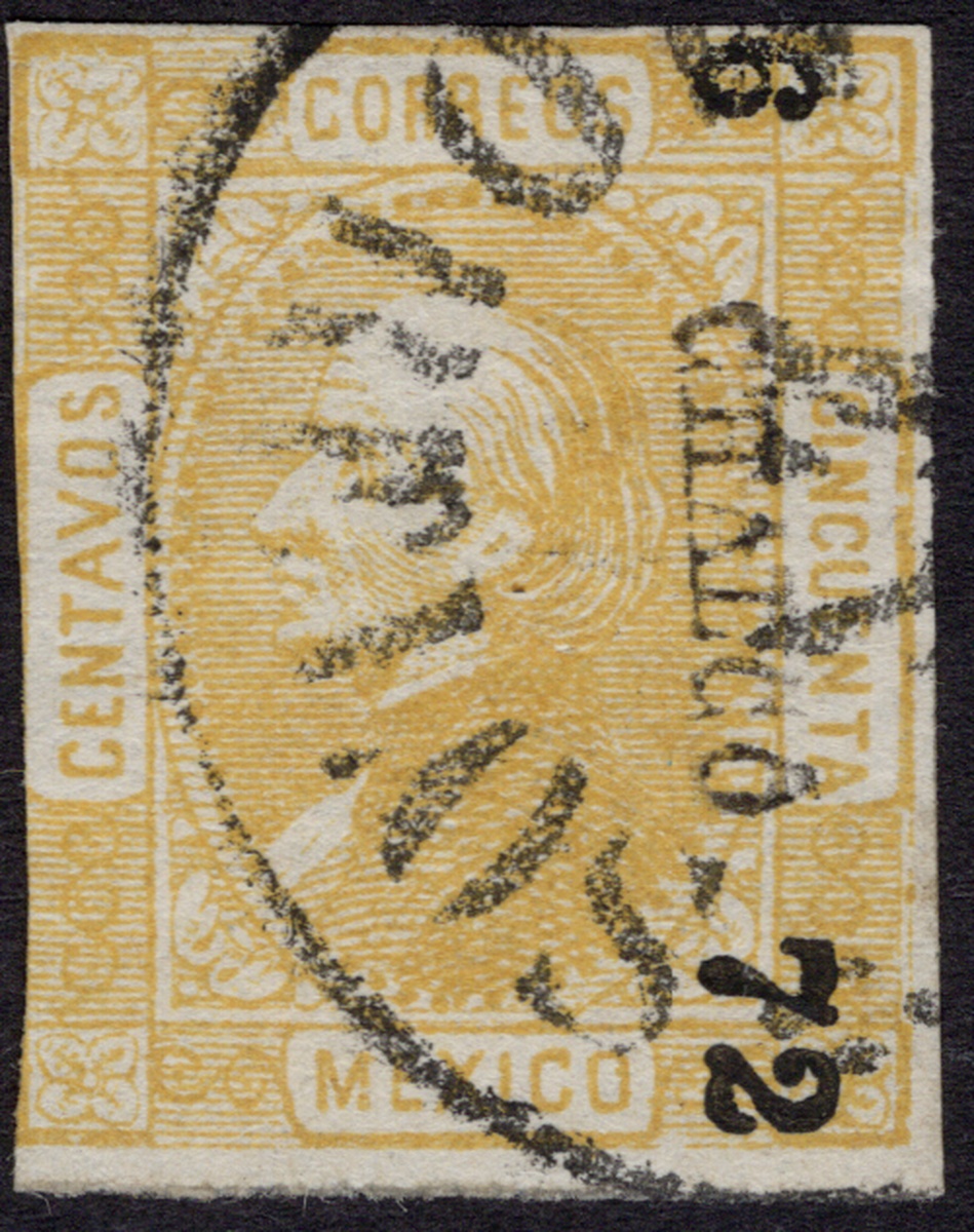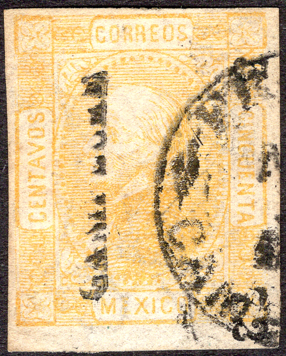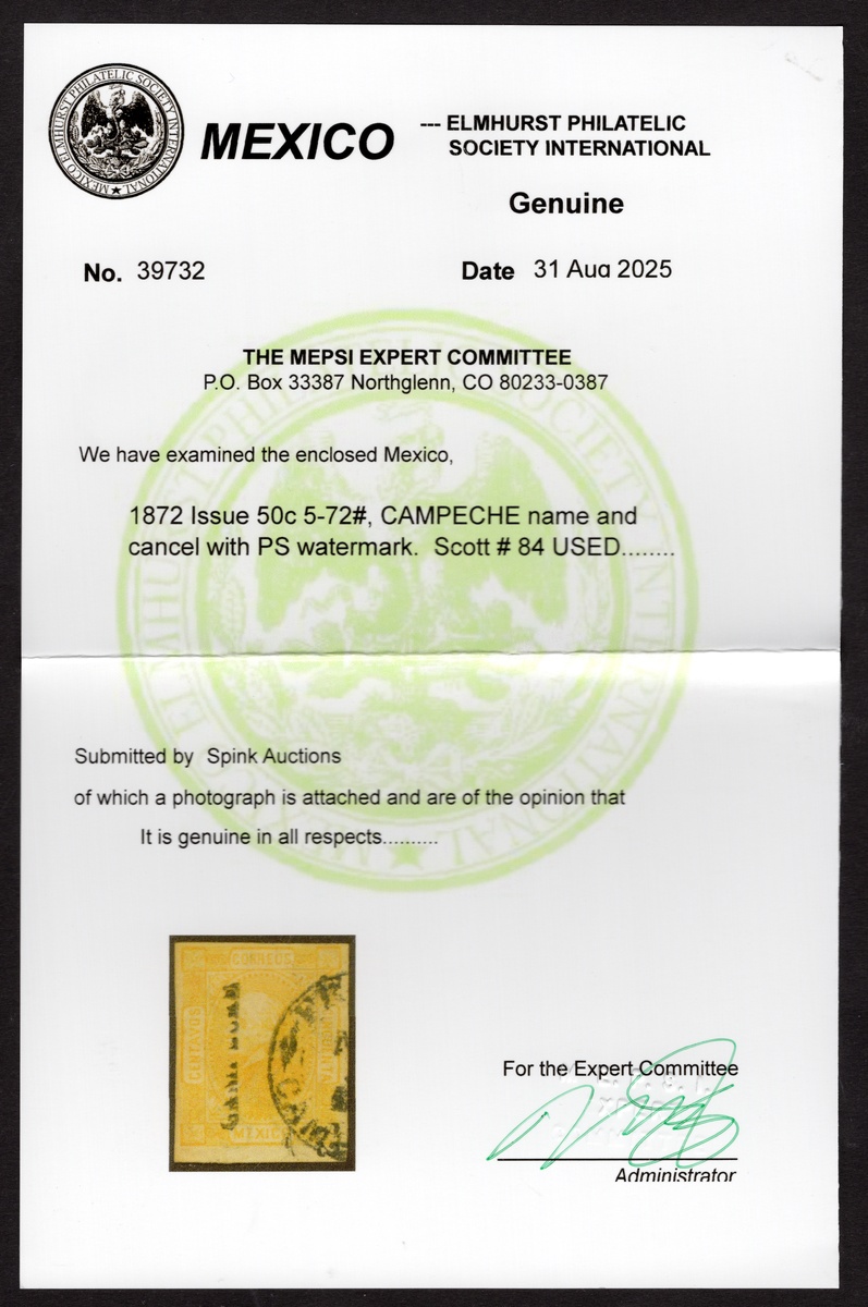 244 Used   imageMexico. 1872 "Hidalgos". Campeche 50c. Yellow (#5-72), imperforate, "Papel Sellado" watermark, used and with clear margins all around. 2025 MEPSI certificate. Scott 84, $850. (Image) (Image2) (All Images)