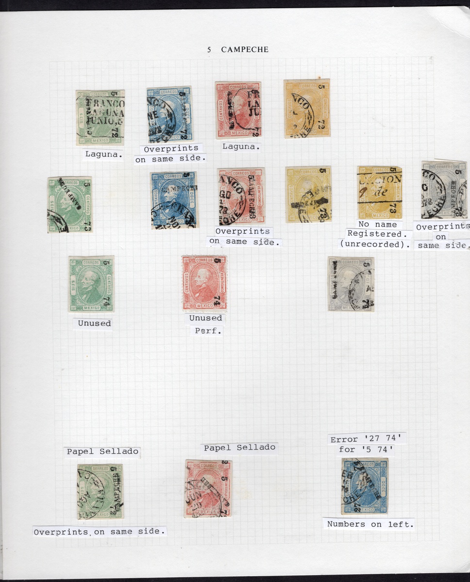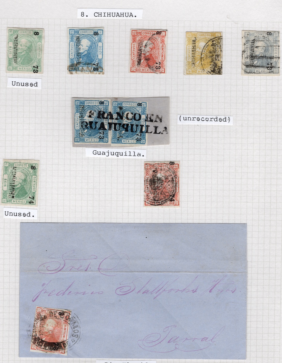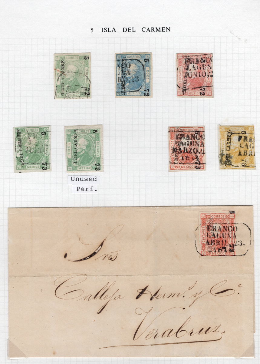 245 Used   imageMexico. 1872 "Hidalgos". Campeche, Chihuahua, Isla del Carmen Group of 32 used and unused stamps, mostly imperforate, and two very attractive covers with 25c. cancelled in Chihuahua–Río Florido and Isla del Carmen. The stamps are neatly mounted on presentation pages (consignments 5 and 8) with different consignment years 1872–74, each in a row, with no duplication. The group includes denominations from 6c. to 100c., except for Isla del Carmen which is from 6c. to 50c., as well as two stamps with "Papel Sellado" watermark. Cancels include Laguna, Campeche, Certificación, Chihuahua, and Guajuquilla. Stamps display a very attractive condition overall, many displaying three or four clear margins. Scott 81, 83, 93-96, 98, 99, 101; NF and Scott (for watermarked stamps) is $ 1,448 for stamps off cover., , (Image) (Image2) (Image3) (All Images)