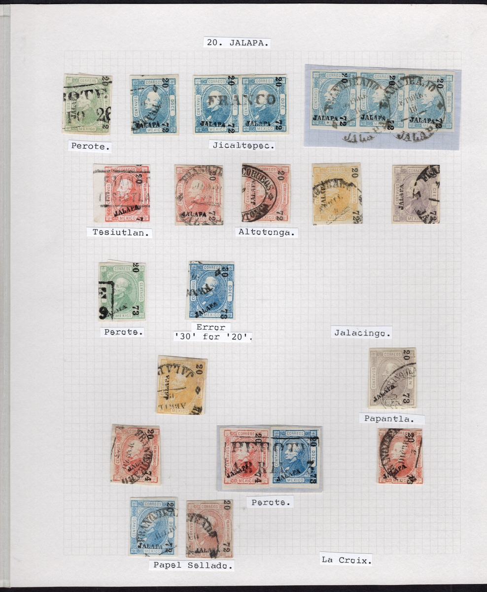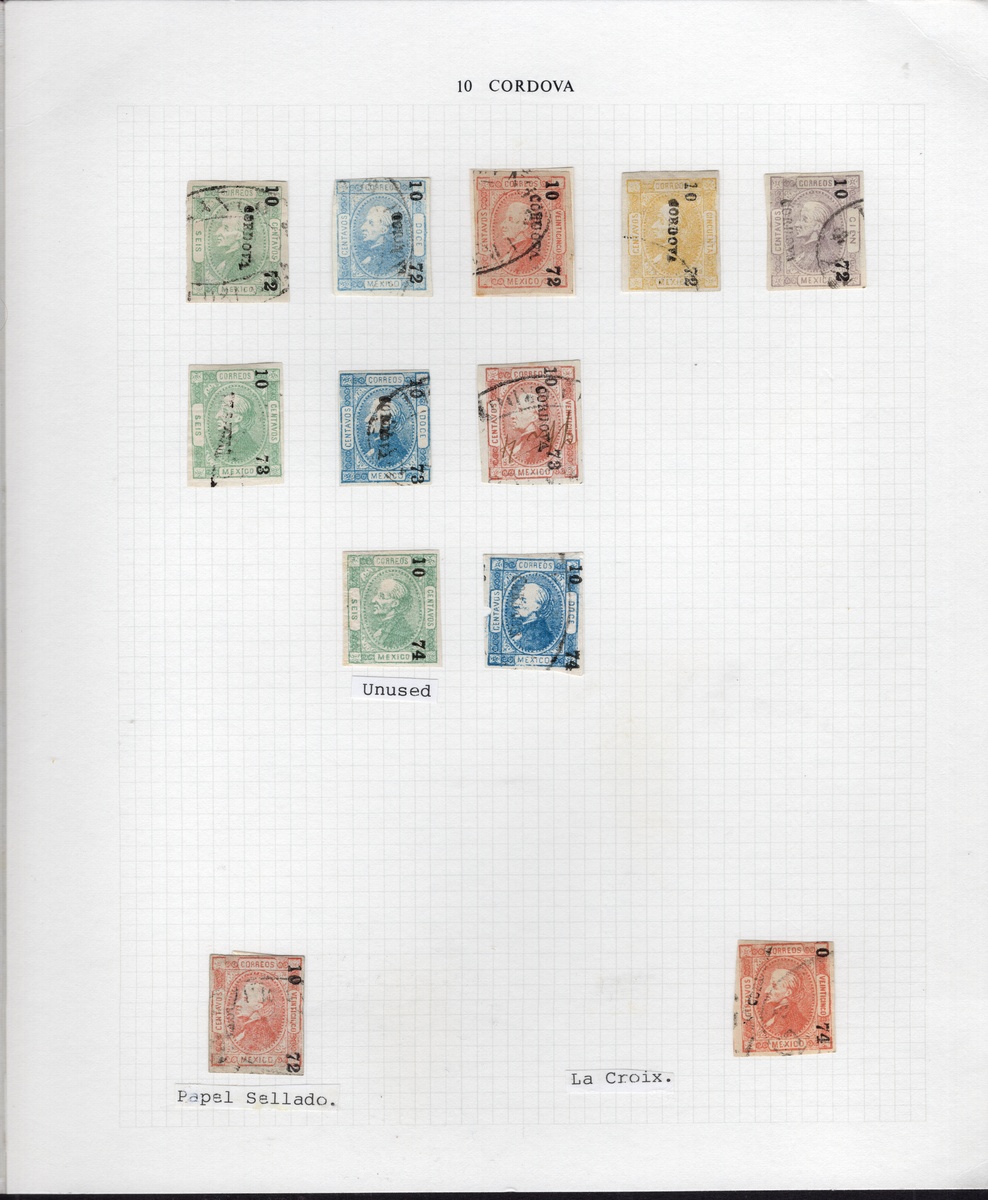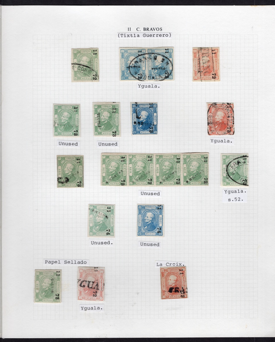 246 Used   imageMexico. 1872 "Hidalgos". Ciudad Bravos/ Tixtla, Jalapa Group of 41 used and unused imperforate stamps, neatly mounted on presentation pages (consignments #11 and 20), with different consignment years 1872–74, each in a row, with no duplication. Ciudad Bravos contains the majority of the unused stamps, including a splendid 6c. strip of four overprinted "C. Bravos". The group includes denominations from 6c. to 100c., as well as five stamps with the "Papel Sellado" or "La Croix Frères" watermark. Cancels include Perote, Jicaltepec, Jalapa, Tesiutlán, Altotonga, Papantla, and Yguala. Additionally, there is the Jalapa consignment error "30-73" for "20-73". The stamps are in very fine condition overall, many with three or four clear margins. Scott # 81-83, 83b, 93-96, 98; NF and Scott (for watermarked stamps) is $1,858 for stamps off cover., , (Image) (Image2) (All Images)