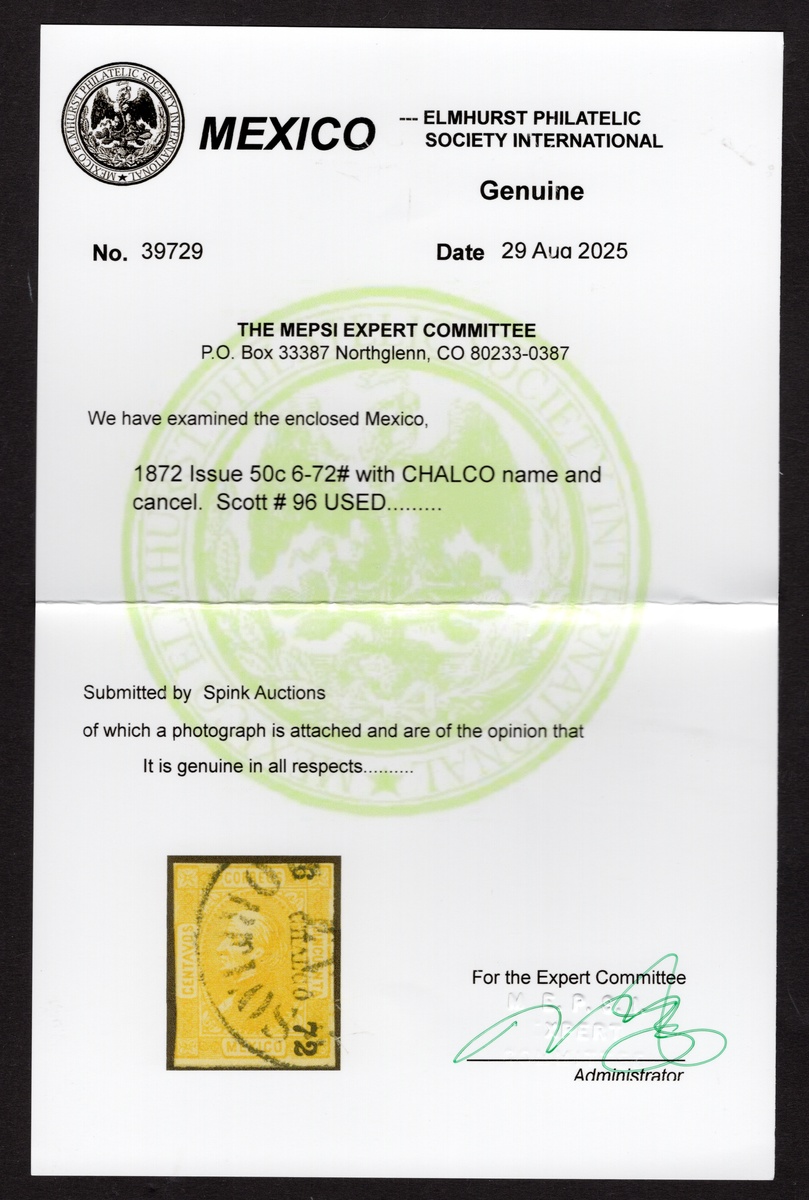 247 Used   imageMexico. 1872 "Hidalgos". Chalco 50c. yellow (#6-72), cancelled in Morelos–Cuautla, margins close, one slightly cutting into at left; despite this, a scarce stamp. 2025 MEPSI certificate. Scott 96; NF $400. (Image) (Image2) (All Images)