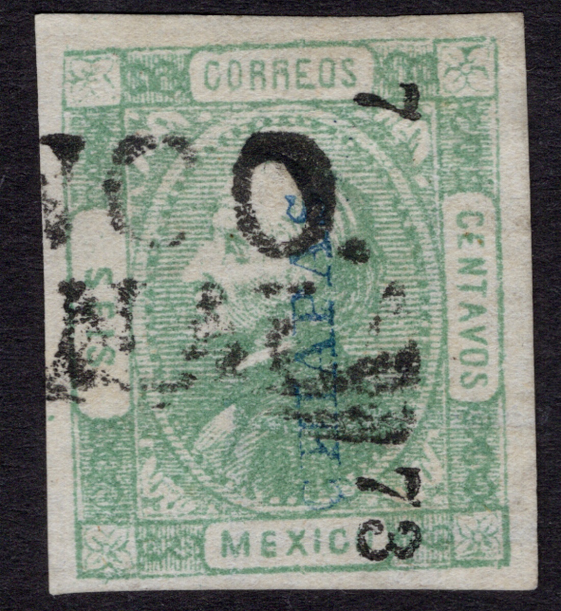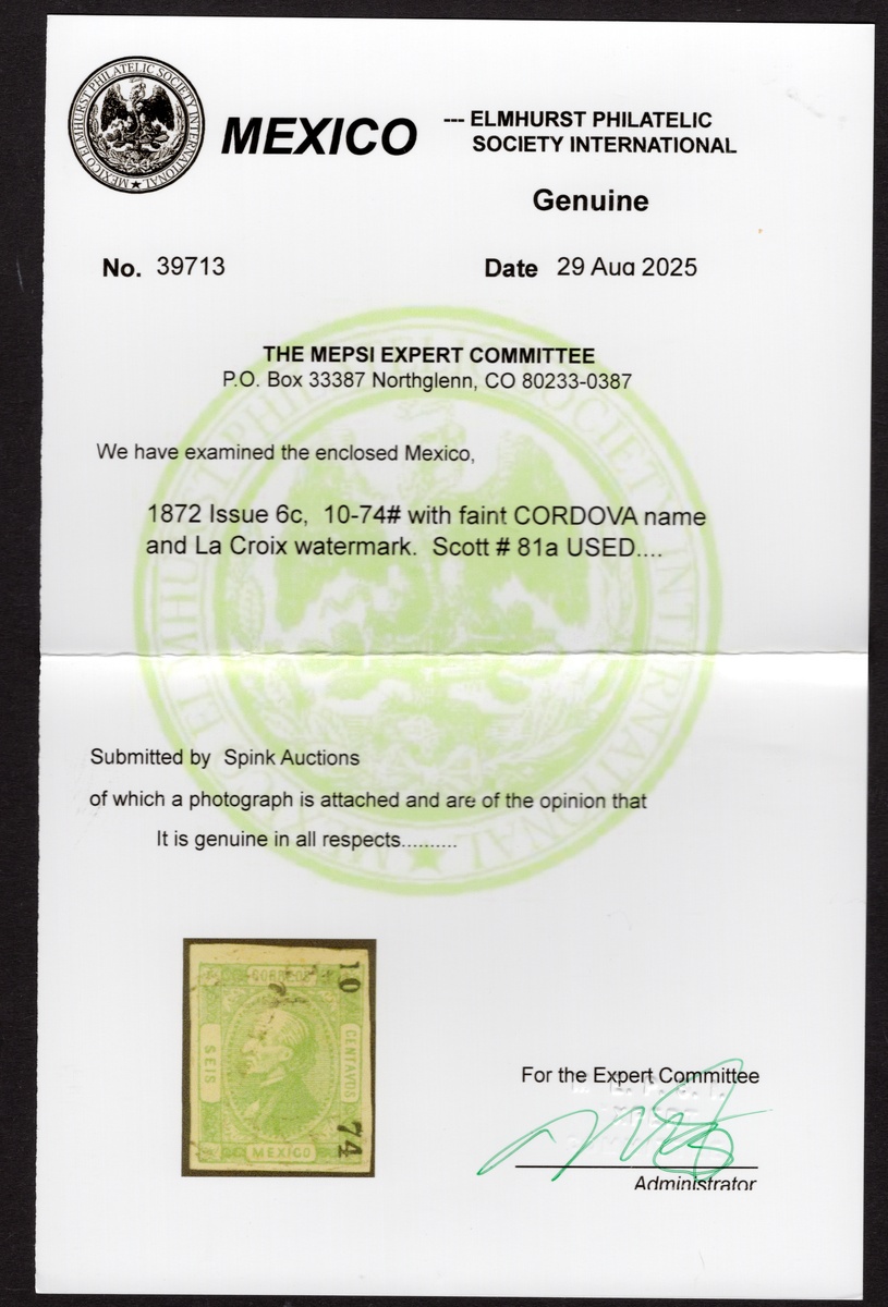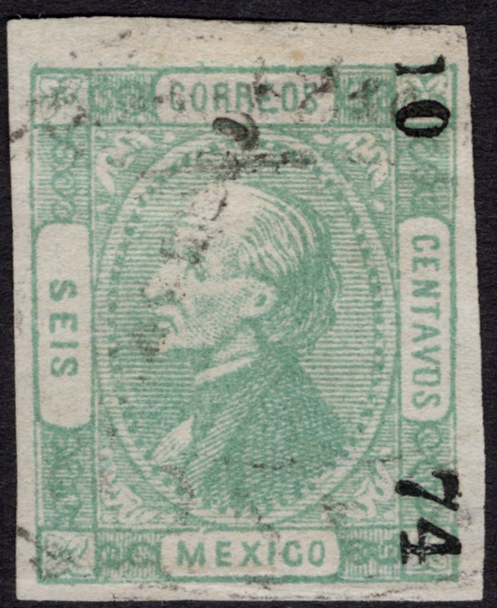 258 Used   imageMexico. 1872 "Hidalgos". Cordova 6c. Green (#10-74), imperforate, possessing "La Croix Frères" watermark, margins all around and in used condition. 2025 MEPSI certificate. Scott 81a, $1,000. (Image) (Image2) (All Images)