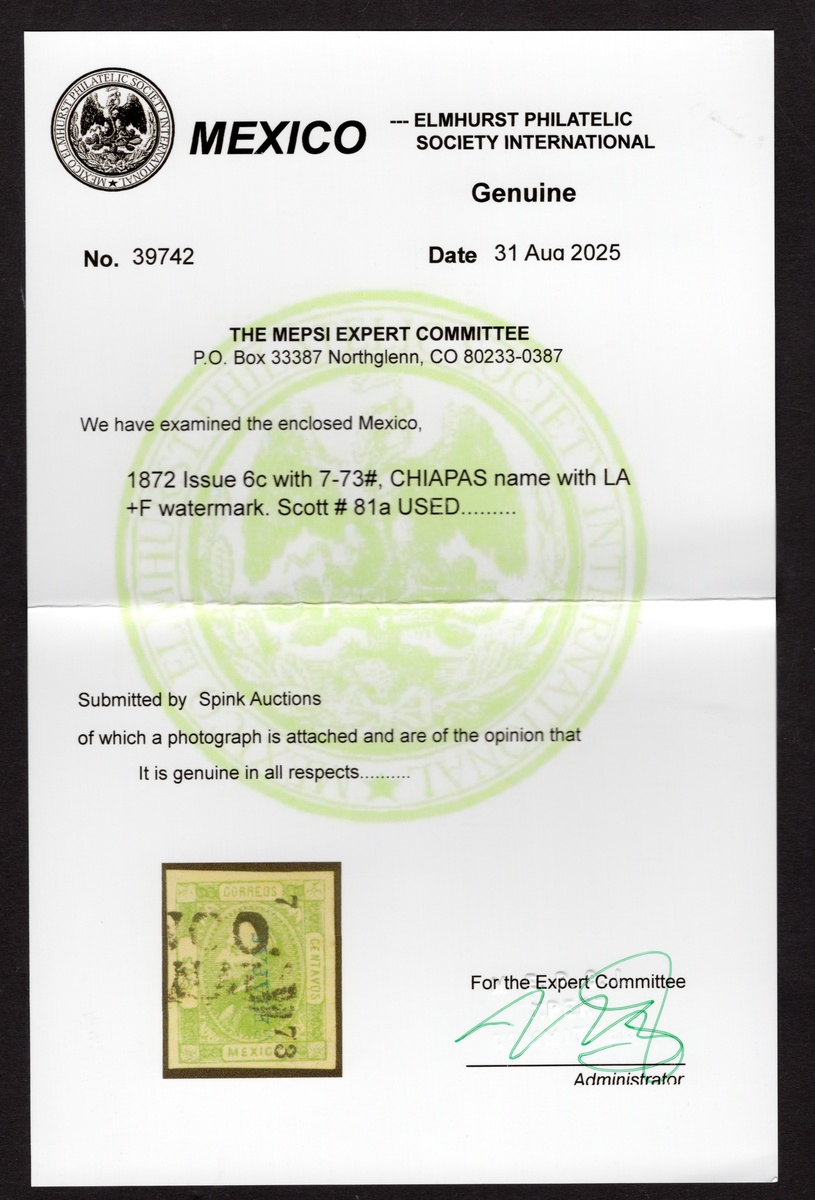 248 Used   imageMexico. 1872 "Hidalgos". Chiapas 6c. Green (#7-73), imperforate used with "La Croix Frères" watermark, clear margins all around. 2025 MEPSI certificate. Scott 81a, $1,000. (Image) (Image2) (All Images)