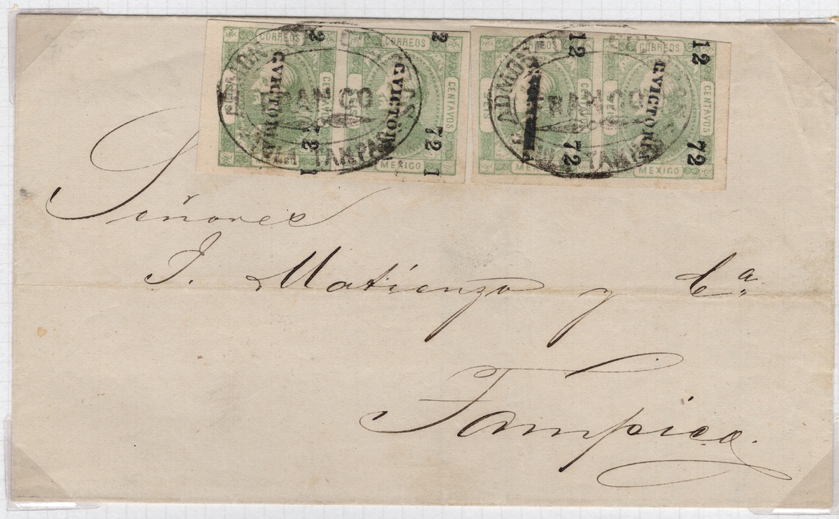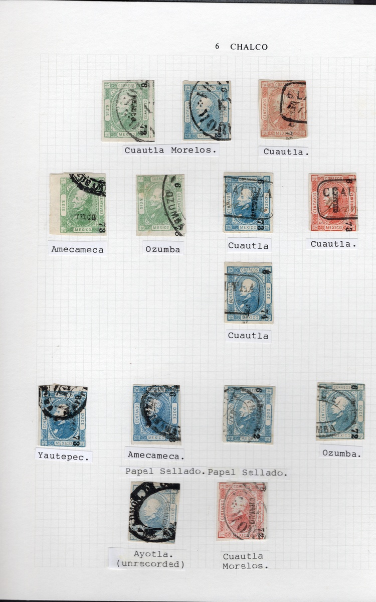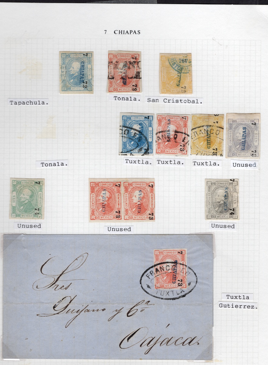 249 Used   imageMexico. 1872 "Hidalgos". Chiapas, Chalco, Cordova Group of 37 used and unused imperforate stamps, and one attractive Chiapas cover with 25c. cancelled in Tuxtla, neatly mounted on presentation pages (consignments 6, 7, and 10) with different consignment years 1872–74, each in a row, with no duplication. The group includes denominations from 6c. to 100c., except for Chalco, which includes 6c. to 25c., as well as four examples with "Papel Sellado" or "La Croix Frères" watermarks. Cancels include San Cristóbal, Cuautla, Amecameca, Ozumba, Yautepec, Ayotla, and Cordova. Very good condition overall. Scott 82, 83, 83b, 93-96, 98; NF and Scott (for watermarked stamps) is $ 1,761 for stamps off cover., , (Image) (Image2) (Image3) (All Images)