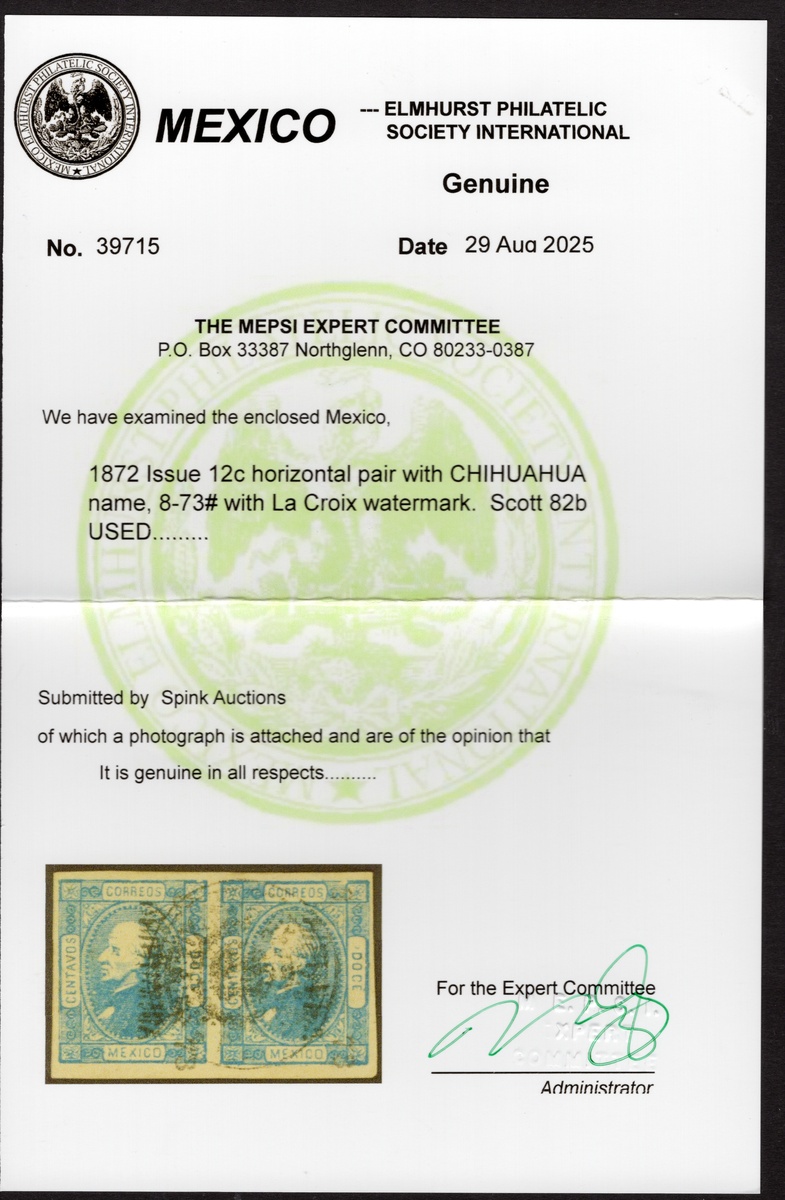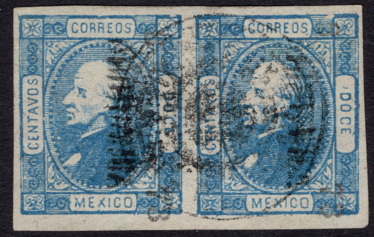 250 Used   imageMexico. 1872 "Hidalgos". Chihuahua 12c. Blue pair (8-73), imperforate, "La Croix Frères" watermark, clear margins all around, in used condition. 2025 MEPSI certificate. Scott 82b, $650. (Image) (Image2) (All Images)