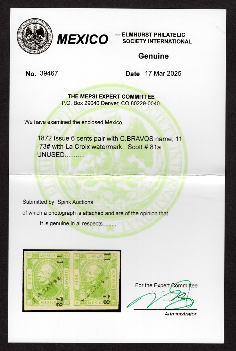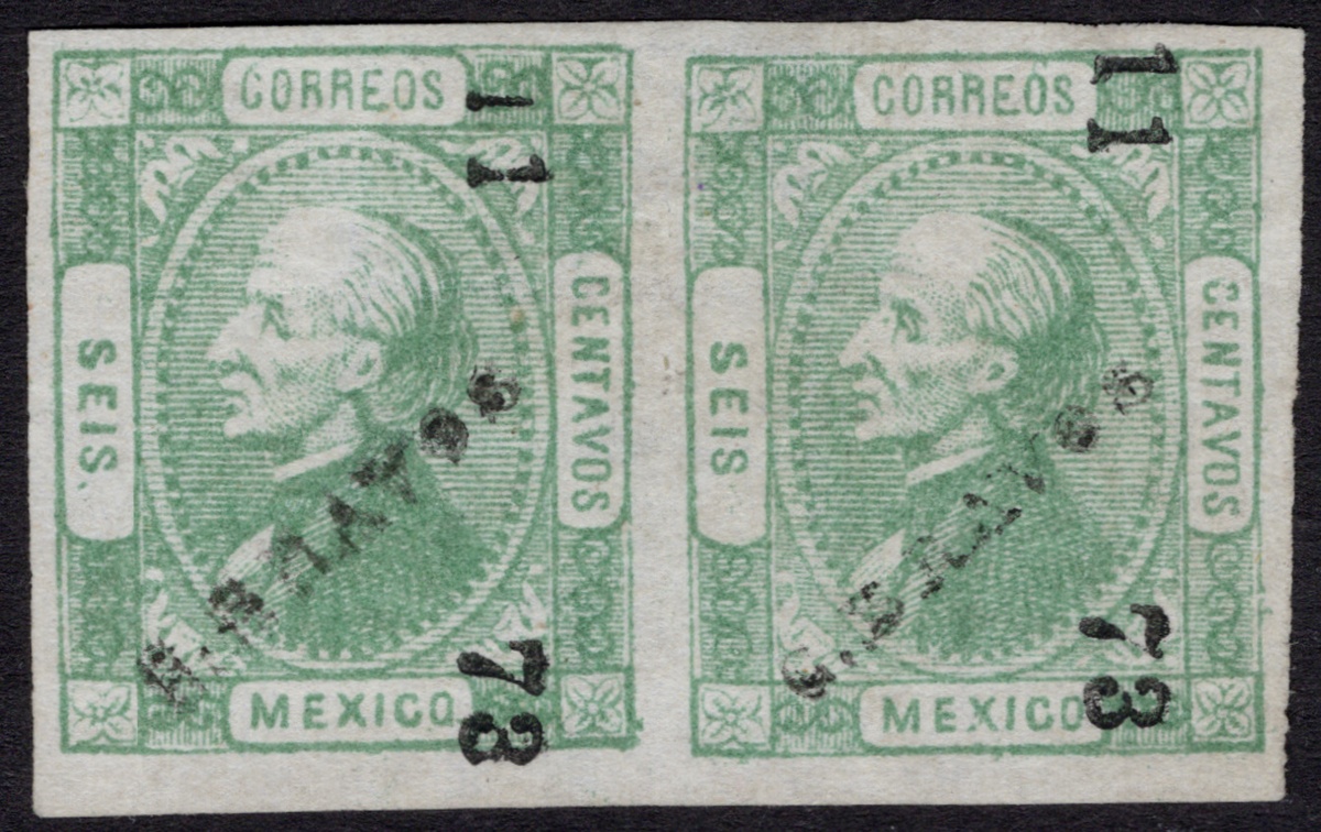 251   imageMexico. 1872 "Hidalgos". Ciudad Bravos 6c. Green (#11-1873), imperforate pair, unused with "La Croix Frères" watermark, showing good margins. 2025 MEPSI certificate. Scott 81a, $4,000. (Image) (Image2) (All Images)