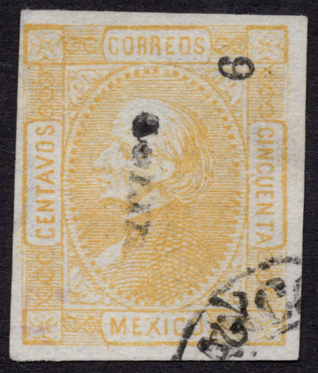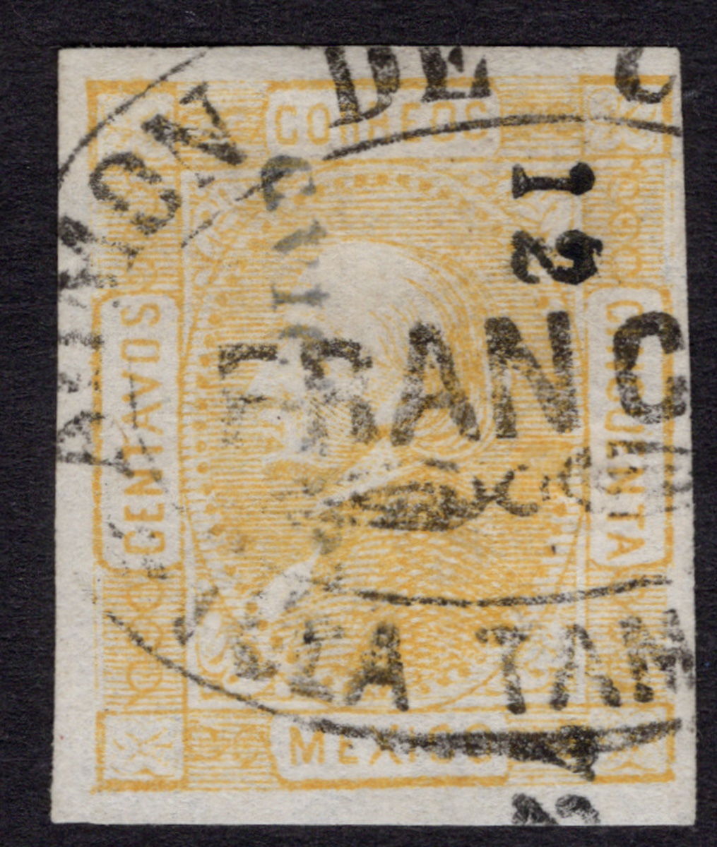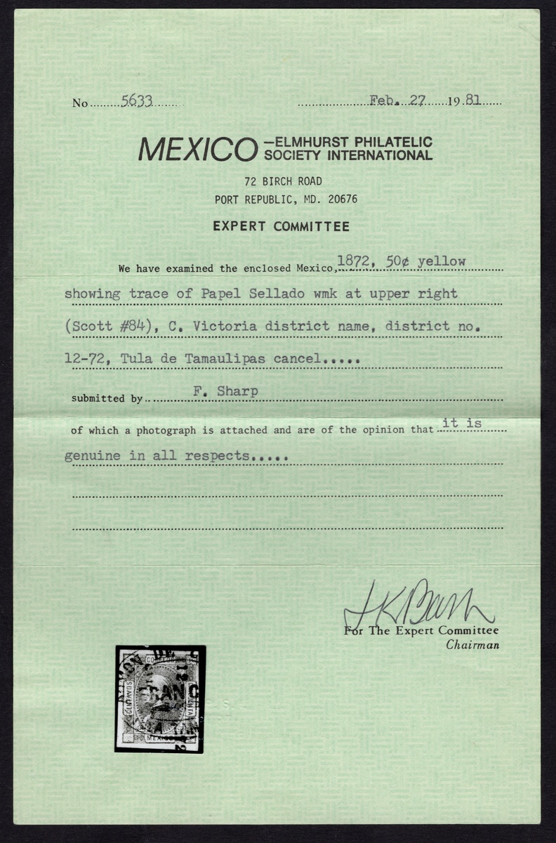 252 Used   imageMexico. 1872 "Hidalgos". Ciudad Victoria 50c. yellow (#12-72), imperforate, used, "Papel Sellado" watermark, margins all around, with a sensational on-the-nose cancel. 1981 MEPSI certificate. Scott 84, $850. (Image) (Image2) (All Images)