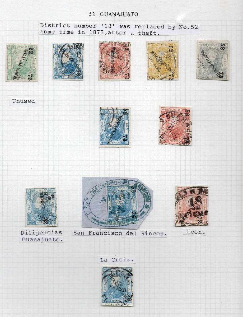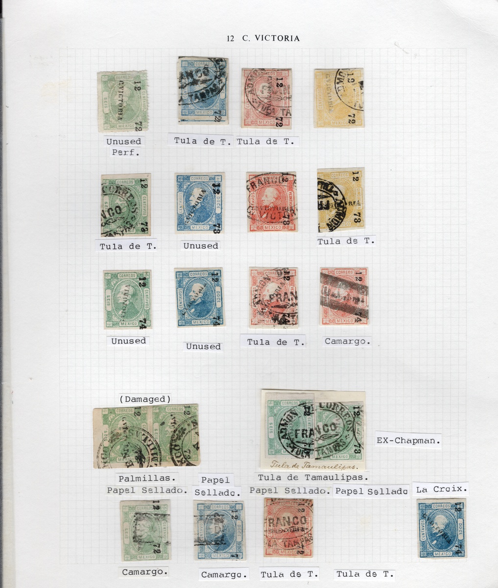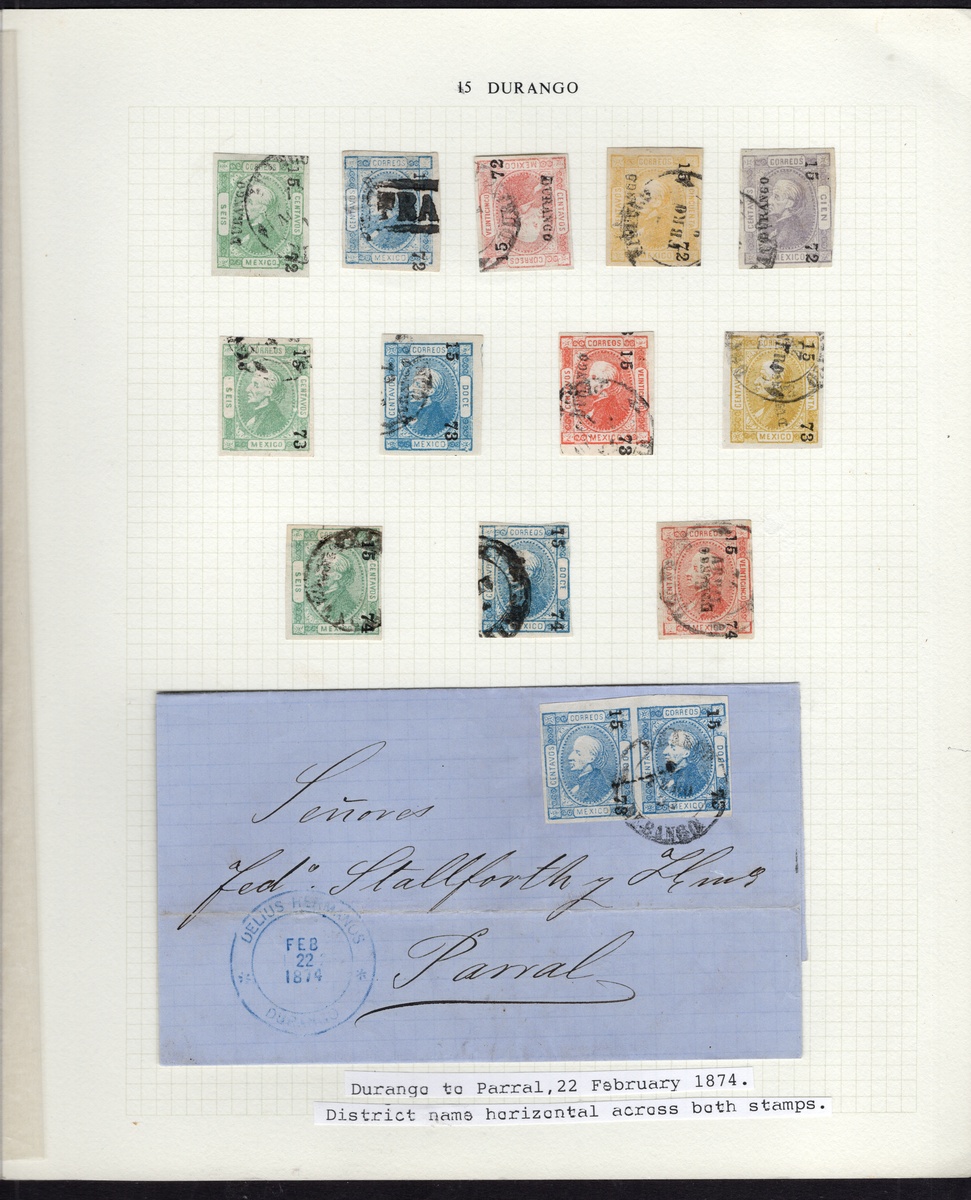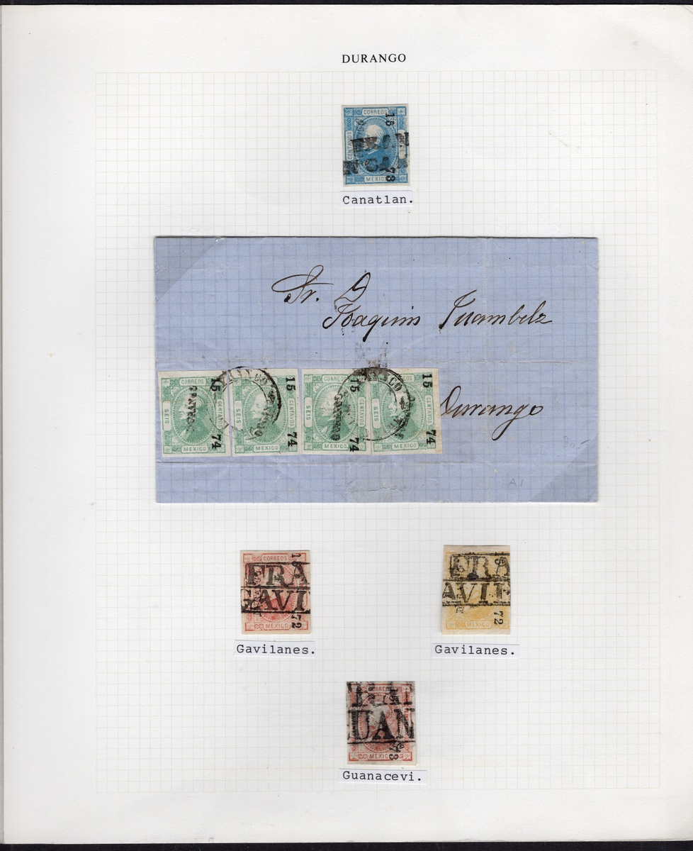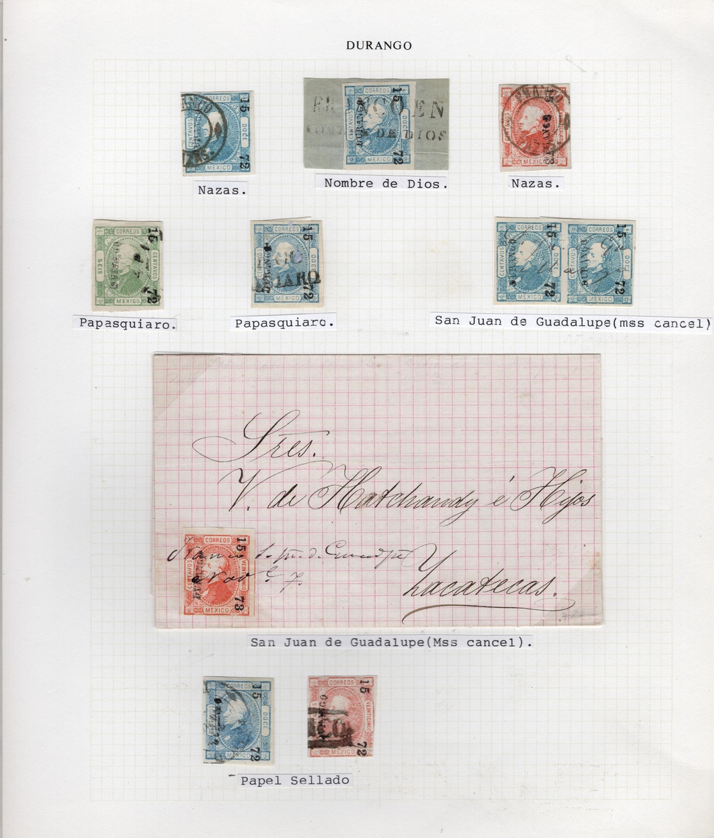 253 Used   imageMexico. 1872 "Hidalgos". Ciudad Victoria, Durango Group of 45 mostly used, imperforate stamps (five unused, one perforated) and four attractive covers. The stamps are neatly mounted on presentation pages (consignments 12 and 15) with different consignment years 1872–74, each in a row, with no duplication, including all denominations for Durango and 6c. to 50c. for Ciudad Victoria, as well as four stamps with "Papel Sellado" or "La Croix Frères" watermarks. The display of cancellations include Canatlán, Cuéncame, Gavilanes, Guanaceví, Durango, Nazas, Nombre de Dios, Papasquiaro, San Juan de Guadalupe, Tula de Tamaulipas, Camargo, and Palmillas (faults but very rare). Stamps are in very good condition overall, many with three or four clear margins. The covers are from Cuéncame, Durango, San Juan de Guadalupe (manuscript cancel), and Tula, all tying the stamps to the cover and being very fine. Scott 81-83, 82b, 93-96, 98, 99; NF and Scott (for watermarked stamps) is $ 919 for stamps off cover., , (Image) (Image2) (Image3) (Image4) (Image5) (All Images)