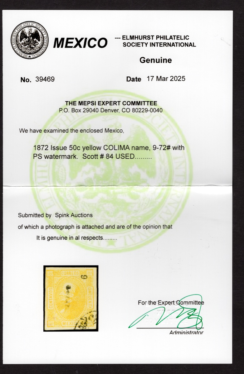 254 Used   imageMexico. 1872 "Hidalgos". Colima 50c. Yellow, imperforate used (#9-72) with "Papel Sellado" watermark, margins all around. 2025 MEPSI certificate. Scott 84, $850. (Image) (Image2) (All Images)