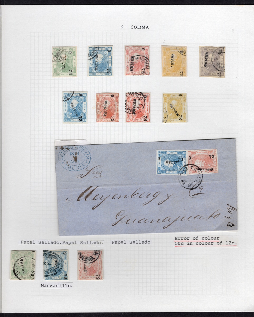 257 Used   imageMexico. 1872 "Hidalgos". Colima, Guanajuato Group of 23 stamps (used and unused) plus one cover, all neatly mounted on presentation pages (Consignments #9 and #52), with different consignment years 1872-74 each in a row, with no duplication. The stamps range from 6c. to 100c. and include four examples with the “Papel Sellado” or “La Croix Frères” watermark. Notably, a 12c. Blue with “Papel Sellado” watermark is cancelled at the tiny port of Manzanillo. Many stamps exhibit three or four margins. The cover, an attractive Colima to Guanajuato usage (#9-73), has a minor folding crease that does not affect the stamps. Scott 81-83, 82b, 93-96, 98; NF and Scott (for watermarked stamps) is $1,178 for stamps off cover., , (Image) (Image2) (All Images)