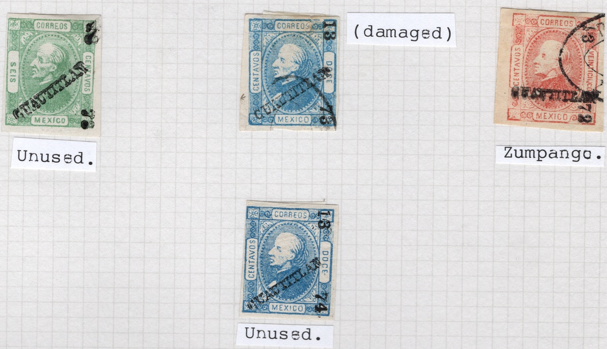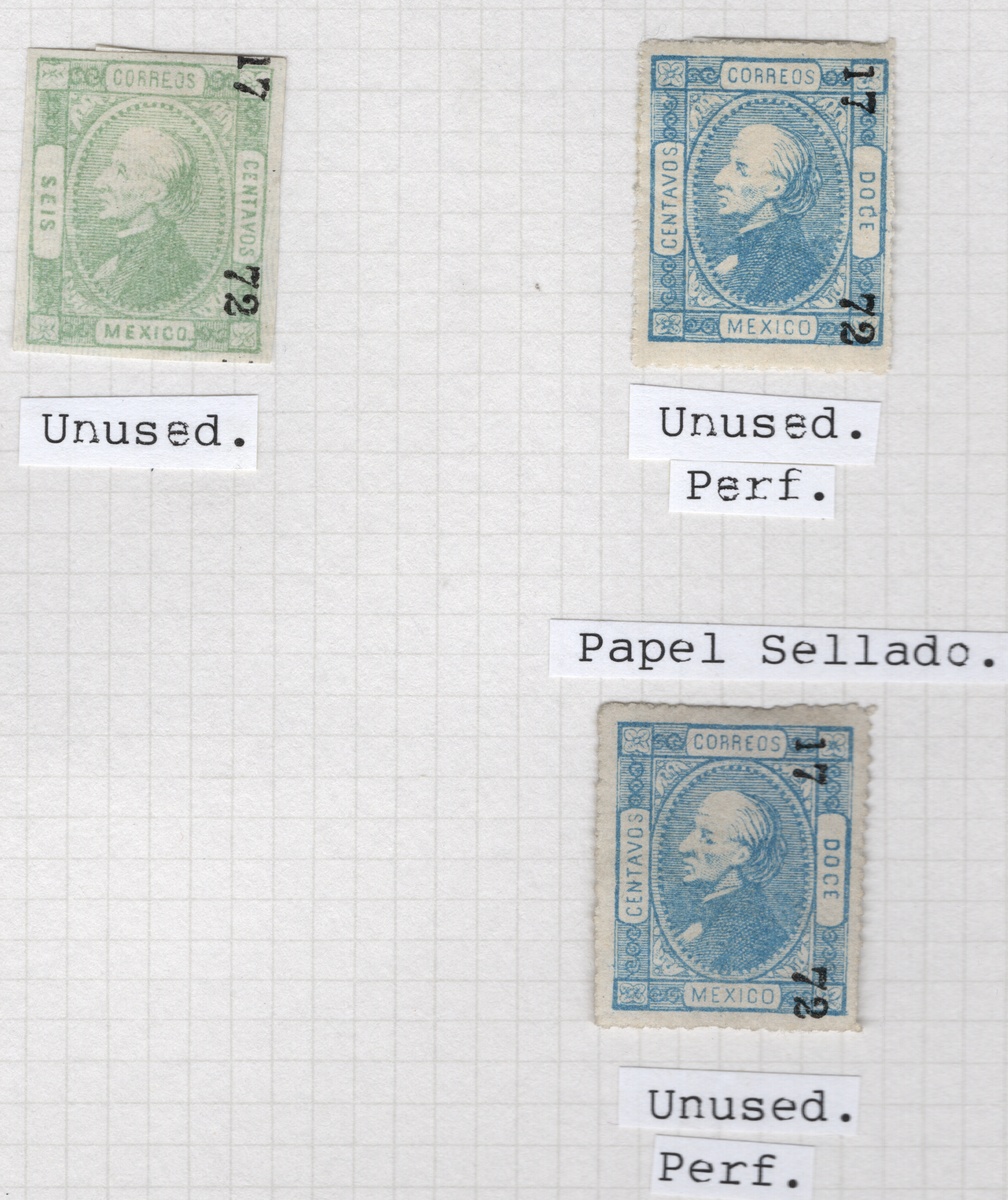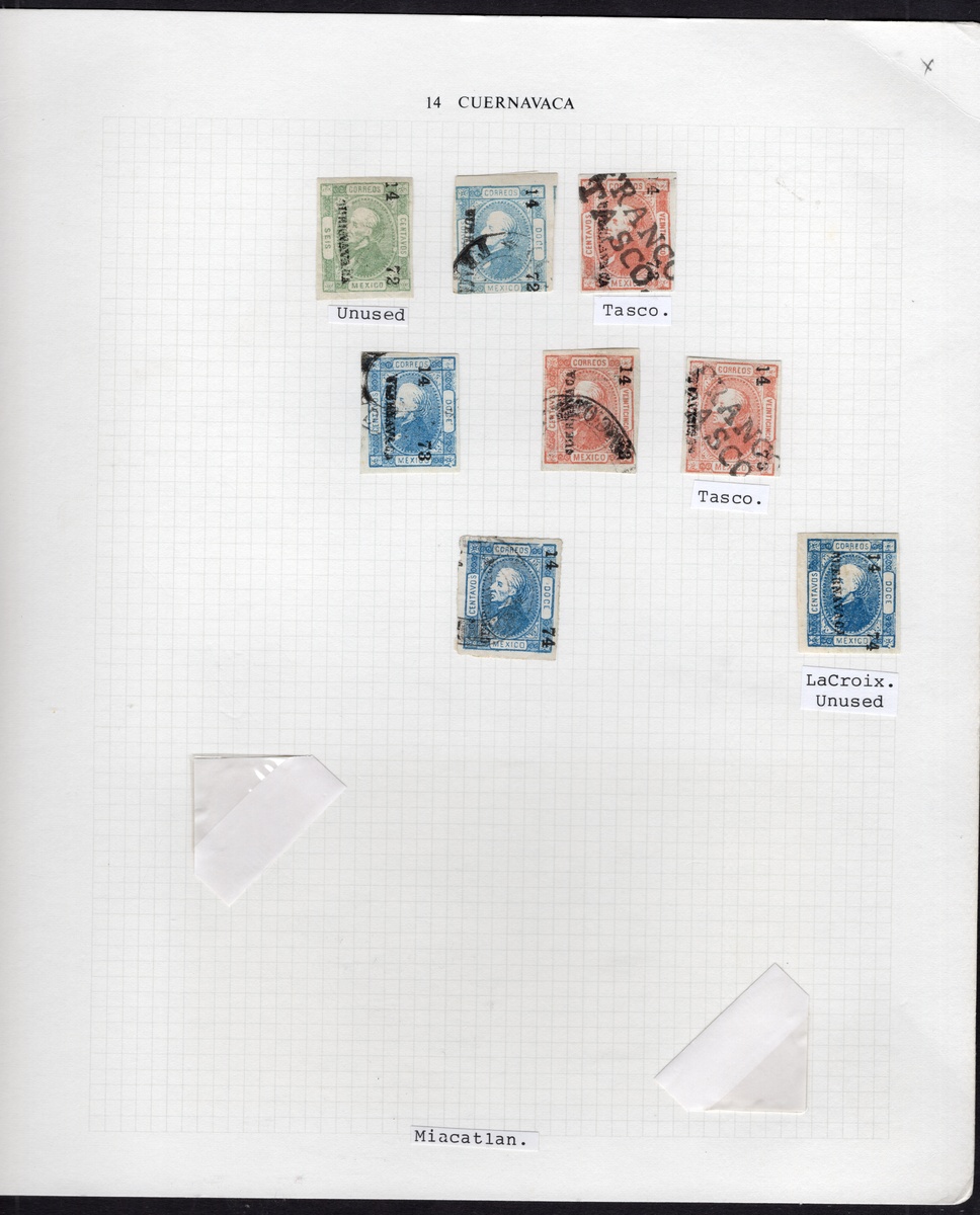 259 Used   imageMexico. 1872 "Hidalgos". Cuautitlán, Cuernavaca, Guadalupe Hidalgo Group of 15 used and unused stamps, all imperforate except two, attractively mounted on presentation pages (consignments #13, 14, and 15) with different consignment years (1872–74), each in a row, with no duplication, including denominations from 6c. to 25c., except for Guadalupe Hidalgo, which includes 6c. to 12c., as well as one stamp watermarked "Papel Sellado" (Guadalupe Hidalgo) and another with "La Croix Frères" watermark (Cuernavaca). Cancels include Zumpango, Taxco, and Cuernavaca. Very fine condition overall, many with three or four clear margins; one 12c. blue Cuautitlán has faults but is scarce. Scott 82, 82b, 93-95,100; NF and Scott (for watermarked stamps) $ 1,075., (Image) (Image2) (Image3) (All Images)