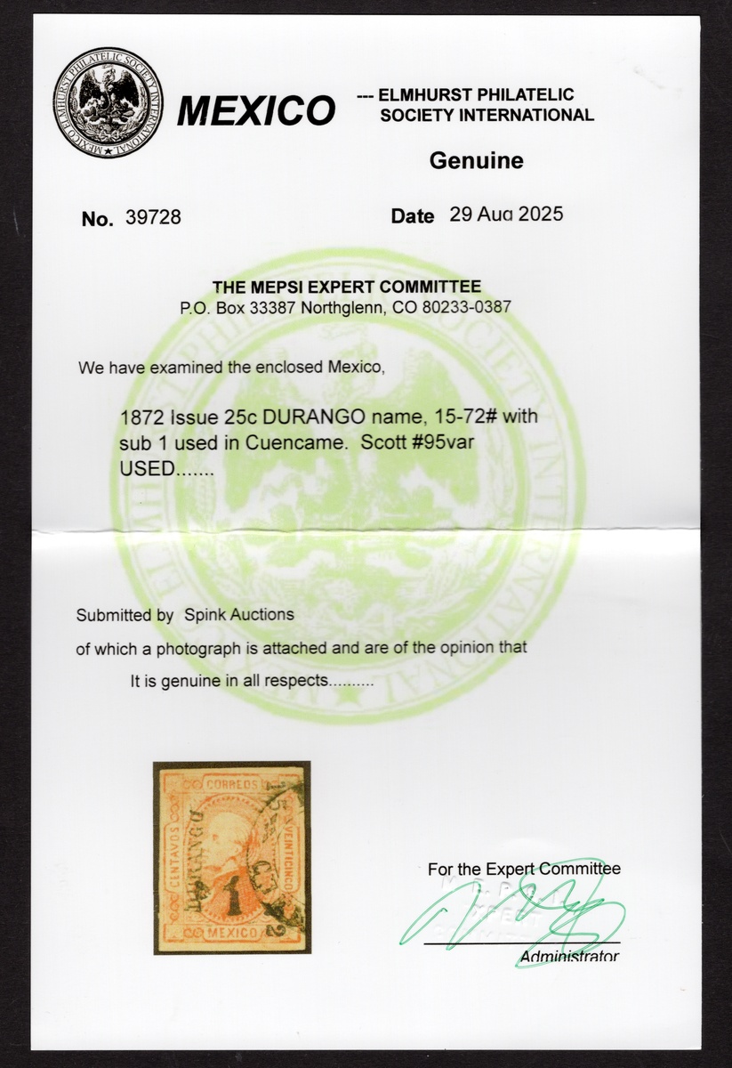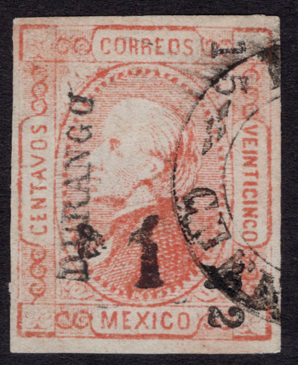 260 Used   imageMexico. 1872 "Hidalgos". Durango-Cuéncame Sub # 1 25c. red (#15-72), imperforate, bearing the rare sub #1 from Cuéncame, margins all around, used with pen cancellation. Durango is the only district that applied additional sub-office number overprints to twelve suboffices for a brief period (September 1872-May 1873), all being very rare. 2025 MEPSI certificate. Scott 95 var; NF $300. (Image) (Image2) (All Images)