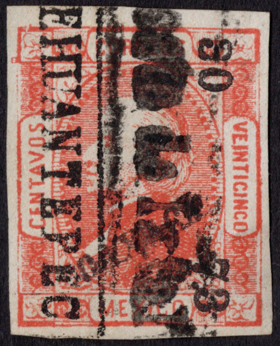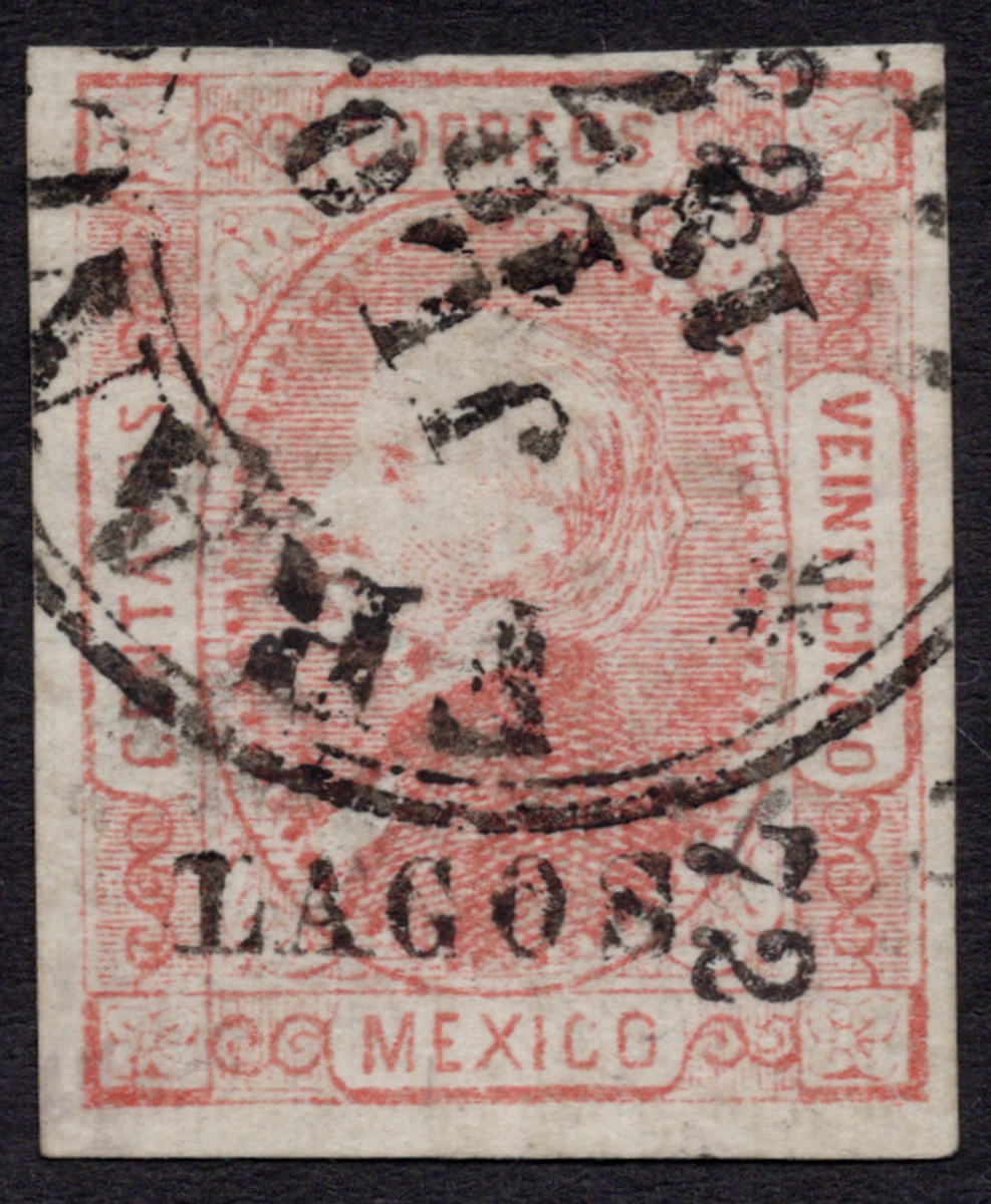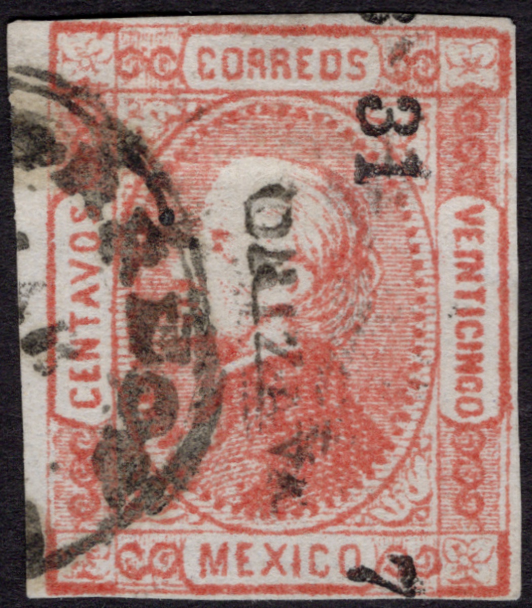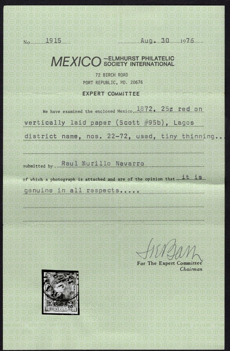 281 Used   imageMexico. 1872 "Hidalgos". Lagos 25c. Red (#22-72) on vertically laid paper, well margined, used, tiny thin spot. 1976 MEPSI certificate. Scott 95b, $500. (Image) (Image2) (All Images)