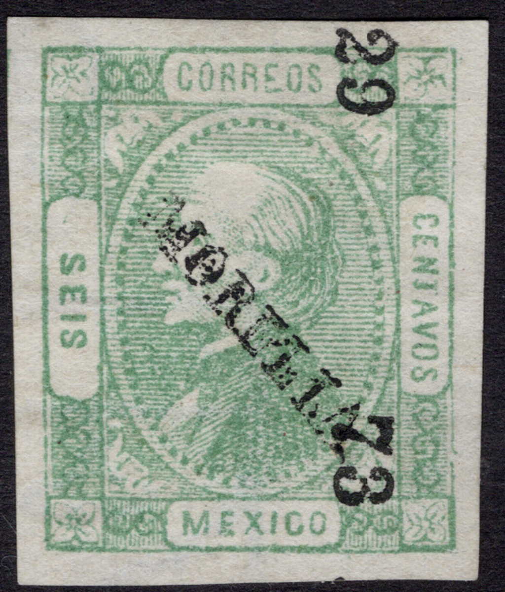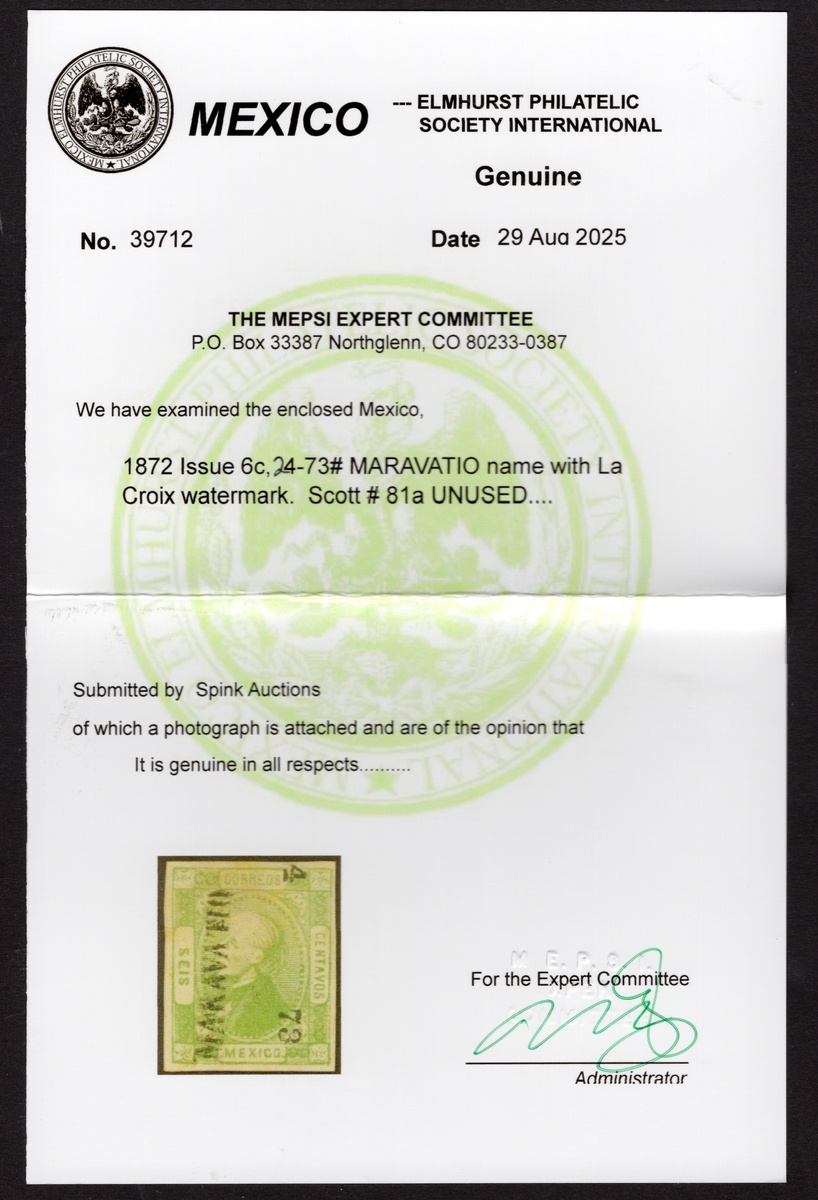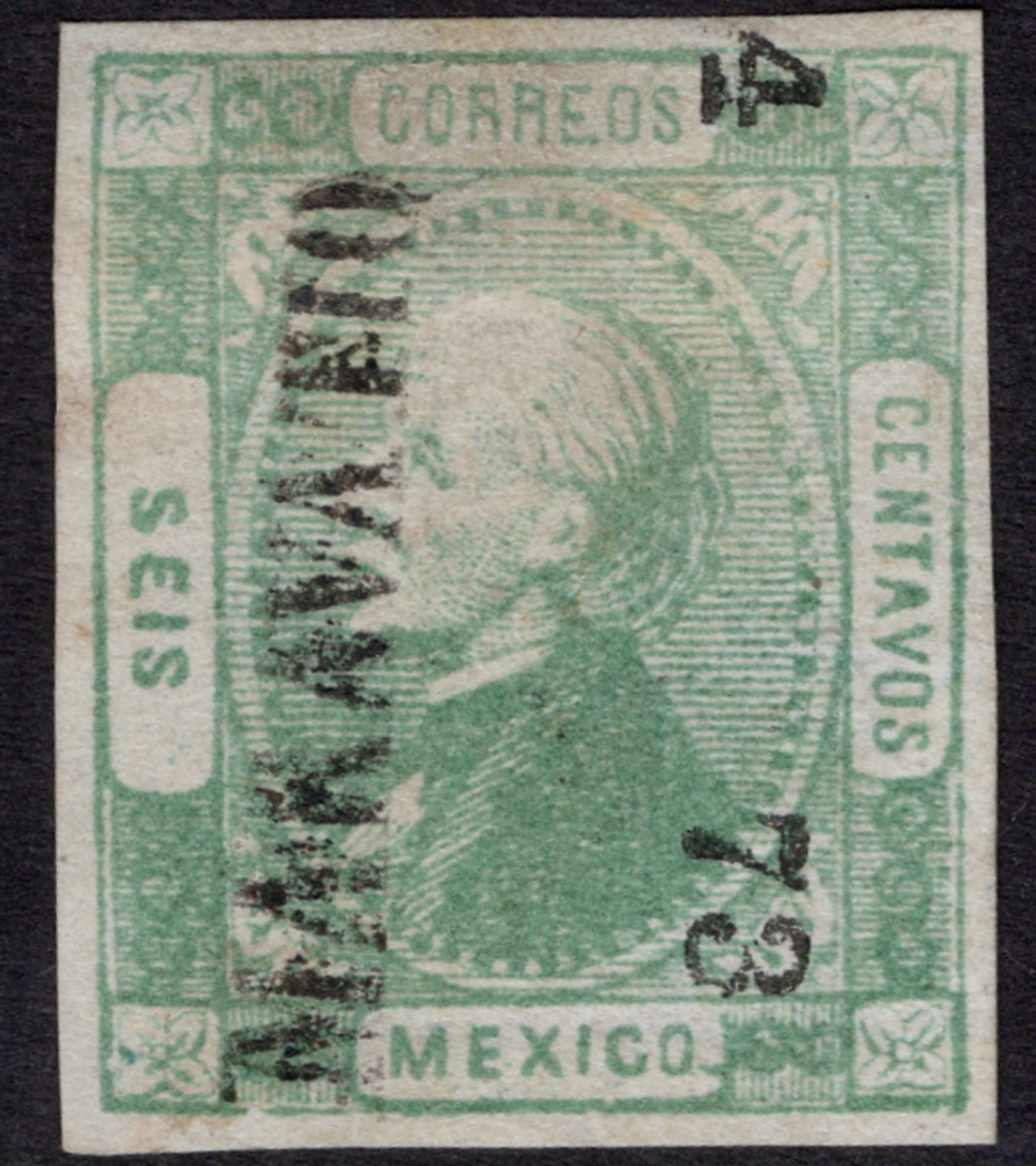 282 Used   imageMexico. 1872 "Hidalgos". Maravatío 6c. Green (#4-73), imperforate, featuring "La Croix Frères" watermark, good margins all around, used. 2025 MEPSI certificate. Scott 81a, $2,000. (Image) (Image2) (All Images)
