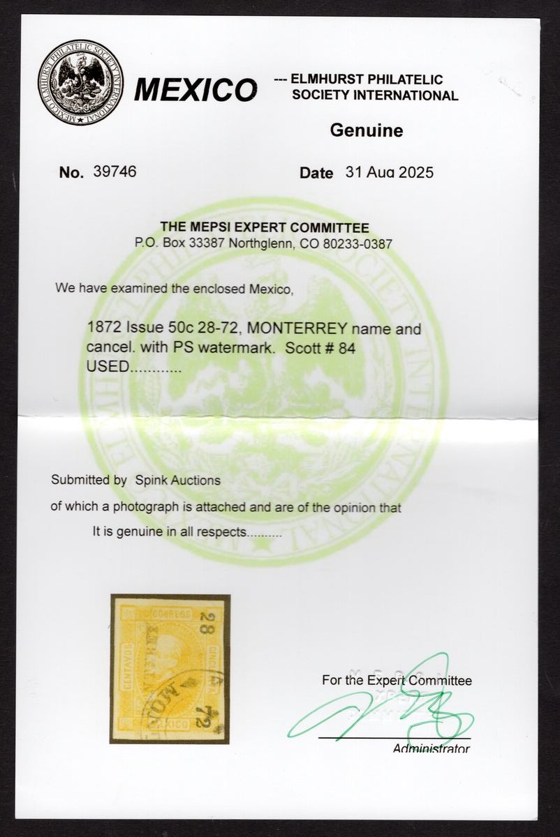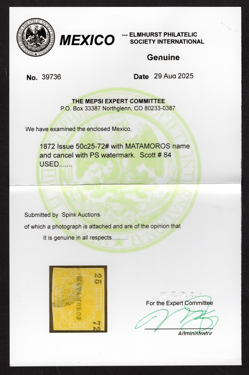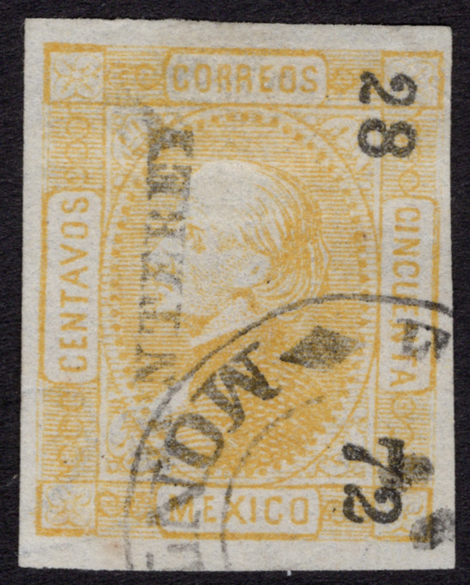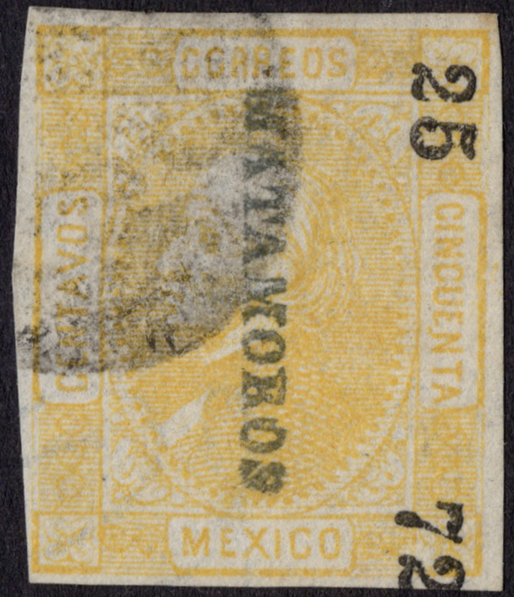 283 Used   imageMexico. 1872 "Hidalgos". Matamoros 50c. Yellow (#25-72) imperforate used, "Papel Sellado" watermark, showing full margins all around. 2025 MEPSI certificate. Scott 84, $850. (Image) (Image2) (All Images)
