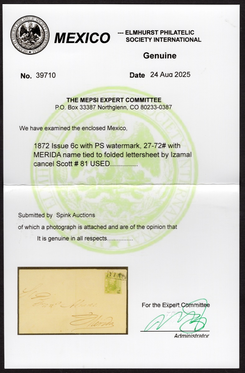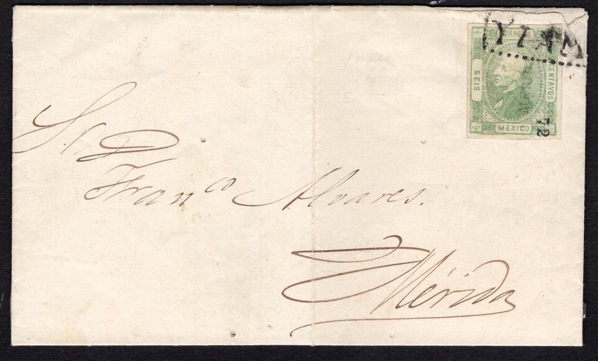 284   imageMexico. 1872 "Hidalgos". Mérida 6c. green (#27-1872), imperforate, featuring "Papel Sellado" watermark, well margined, tied to entire letter from Izamal to Mérida, paying the printed matter rate. Vertical crease and four unobtrusive warm holes, none of them affecting the stamp. Very few covers with this rate have survived. 2025 MEPSI certificate. Scott 81, $275 as a single off-cover. (Image) (Image2) (All Images)
