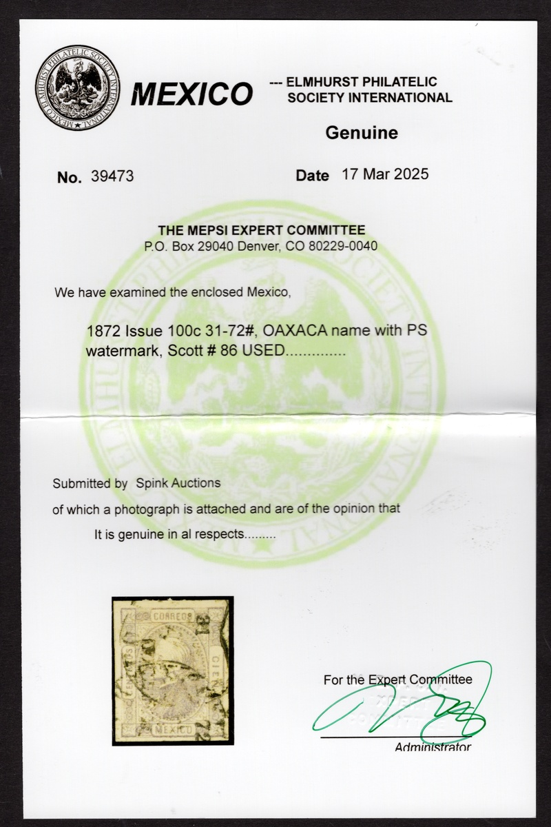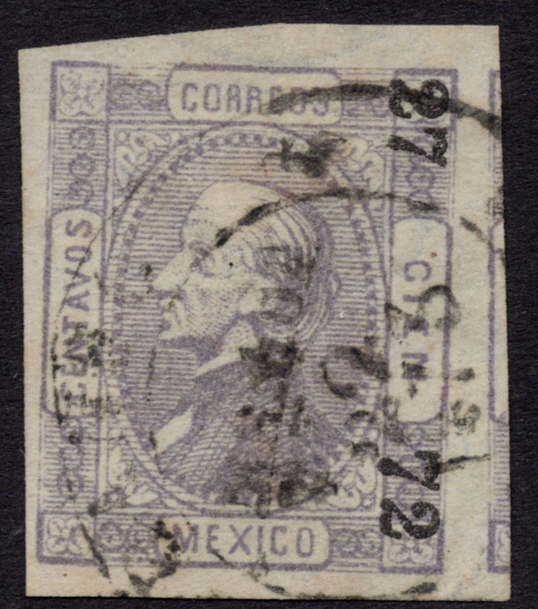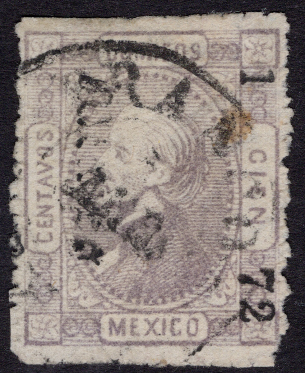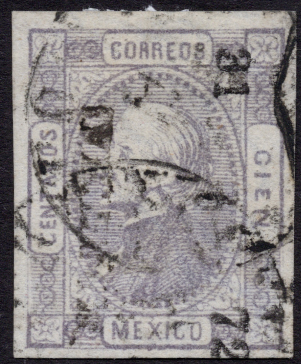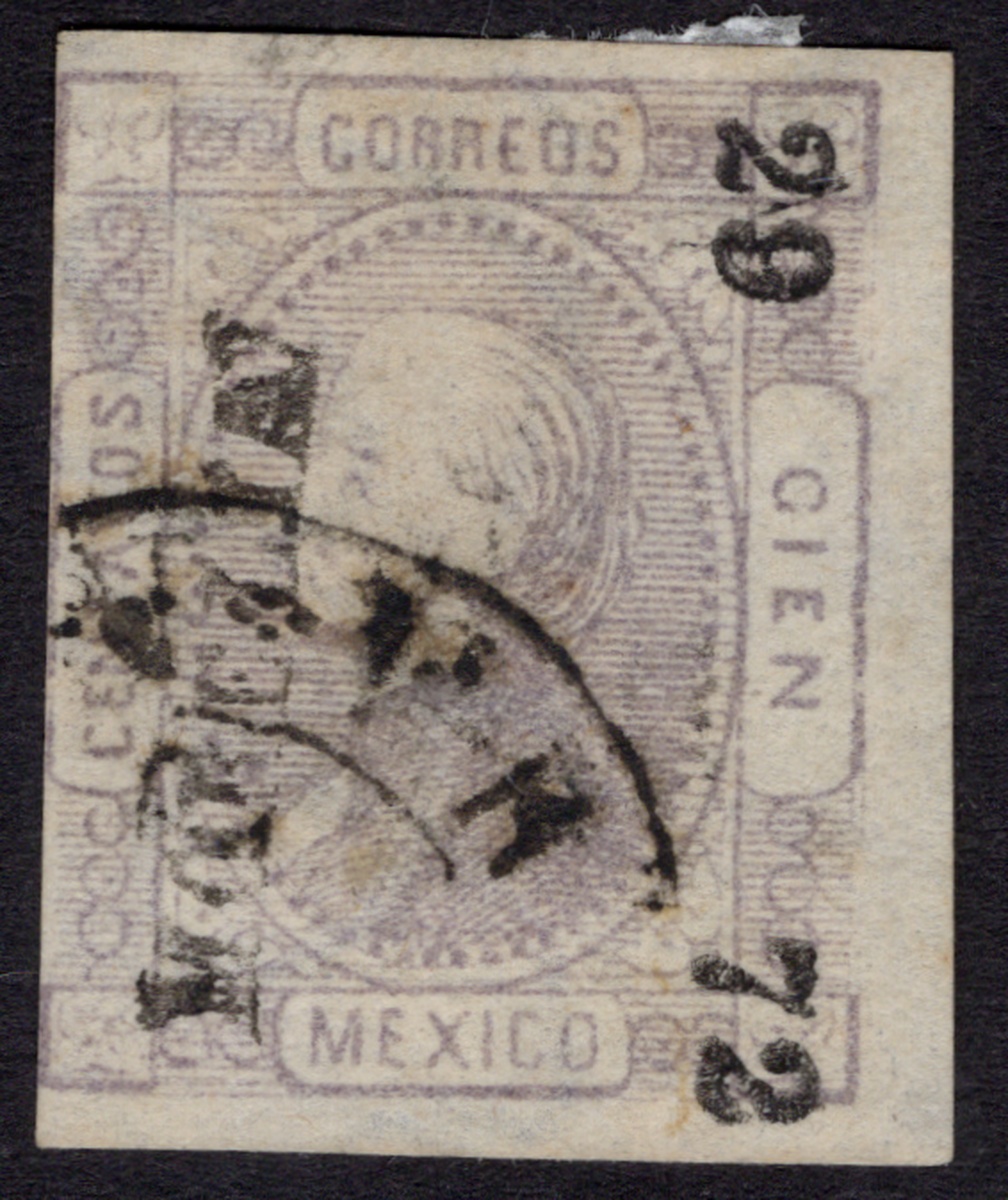 296 Used   imageMexico. 1872 "Hidalgos". Oaxaca 100c. Gray Lilac (#31-72), imperforate used with c.d.s. and "Papel Sellado" watermark, a well margined example. 2025 MEPSI certificate. Scott 86, $650. (Image) (Image2) (All Images)
