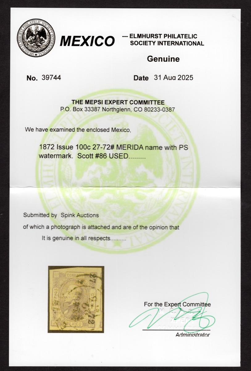 285 Used   imageMexico. 1872 "Hidalgos". Mérida 100c. Gray Lilac (#27-72), imperforate, "Papel Sellado" watermark, showing mute infinite cancel, boasting excellent margins all around. 2025 MEPSI certificate. Scott 86, $650. (Image) (Image2) (All Images)