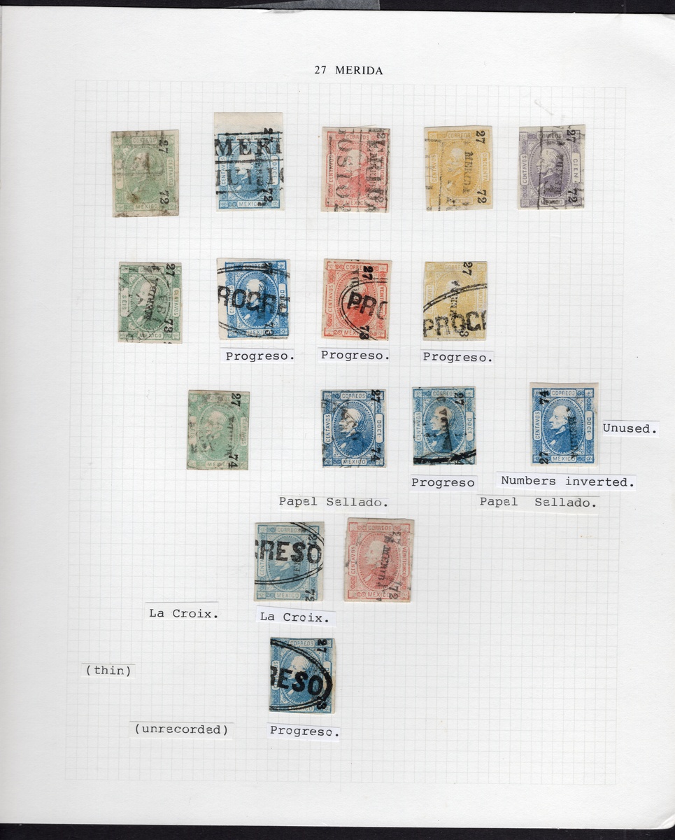 286 Used   imageMexico. 1872 "Hidalgos". Mérida Group of 16 imperforate stamps, all used except one, neatly mounted on presentation page (consignment 27) with different 1872–74 consignment years, without duplication, including all denominations from 6c. to 100c., as well as three stamps with "Papel Sellado" or "La Croix Frères" watermarks. Usages from Mérida and Progreso. Generally in very fine condition, many with three or four clear margins. Scott 82, 83, 82b, 93-96, 98; NF and Scott (for watermarked stamps) is $ 774., (Image)