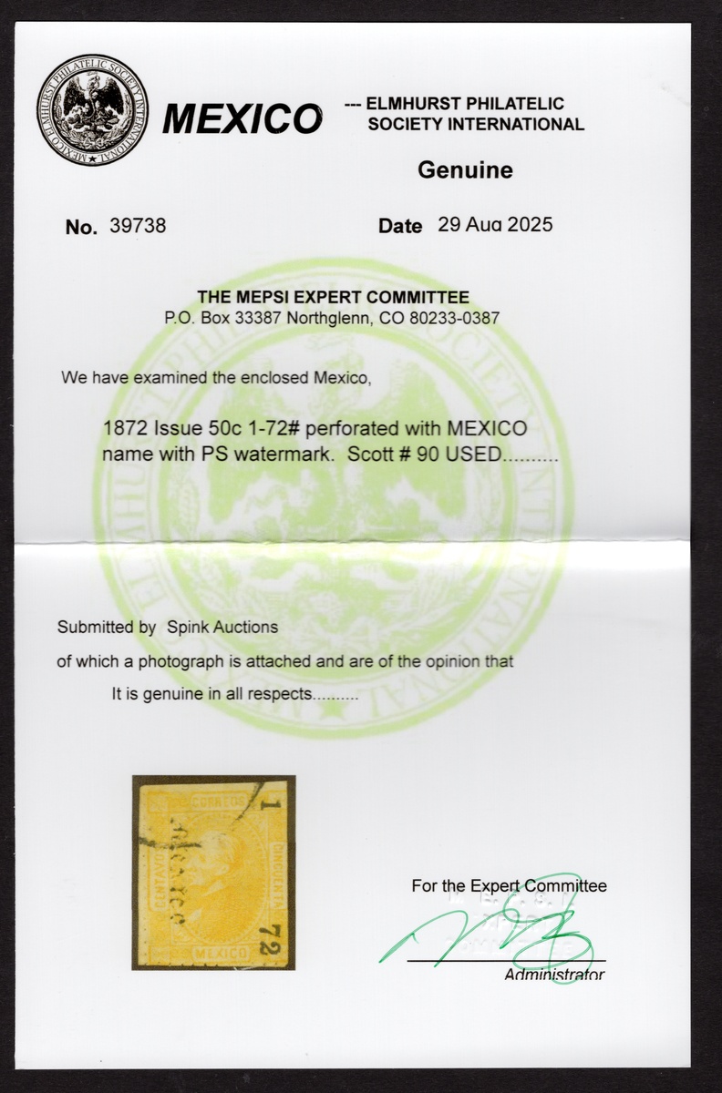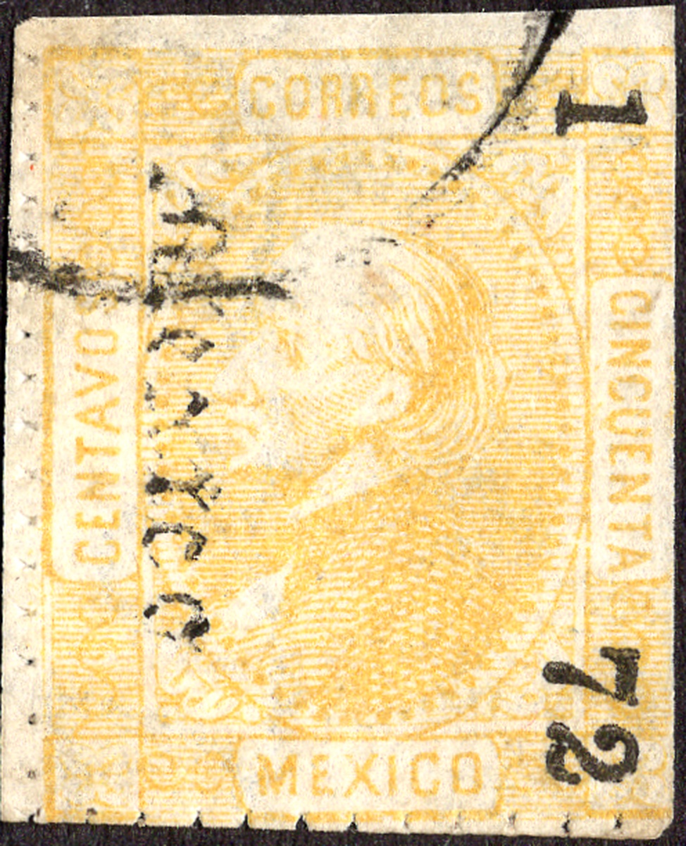 287 Used   imageMexico. 1872 "Hidalgos". Mexico District 50c. Yellow (#1-72), perforated, "Papel Sellado" watermark, a used example with margins close or touching at right and bottom. 2025 MEPSI certificate. Scott 90, $950. (Image) (Image2) (All Images)