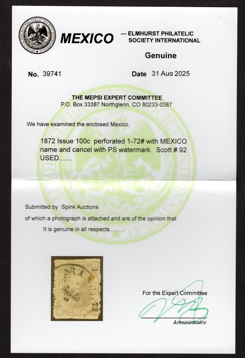 288 Used   imageMexico. 1872 "Hidalgos". Mexico District 100c. Gray (#1-72), perforated, with "Papel Sellado" watermark, margins close with the design nearly touched at right and left, used. 2025 MEPSI certificate. Scott 92, $1,200. (Image) (Image2) (All Images)