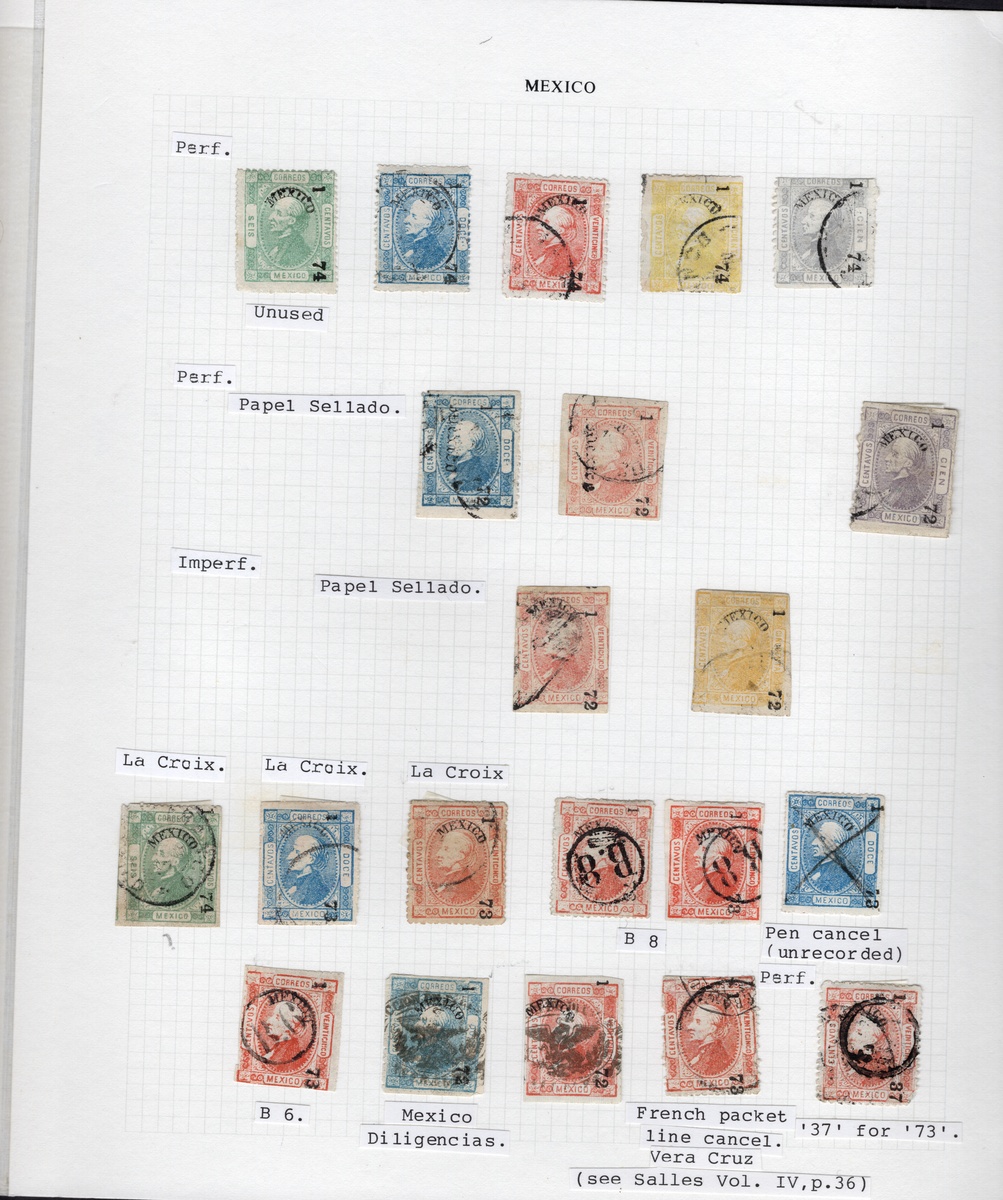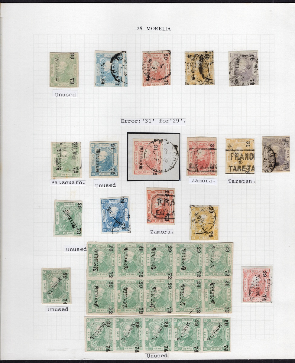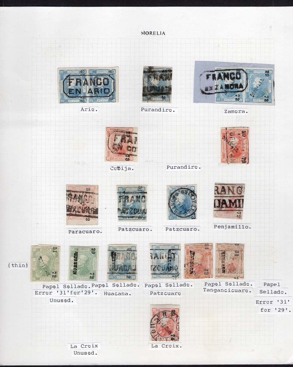 294 Used   imageMexico. 1872 "Hidalgos". Morelia Assembly comprising 50 imperforate stamps, mostly used, on attractive presentation pages (consignment #29), with different consignment years (1872–74) arranged in rows without duplication, including denominations from 6c. to 100c., with seven examples bearing the "Papel Sellado" or "La Croix Frères" watermarks. A complete set from 6c. to 100c. is present, including the consignment error "31" for "29". Many stamps show cancellations from small towns such as Río, Zamora, Puruándiro, Cotija, Parácuaro, Pátzcuaro, Penjamillo, Huacama, Tangacícuaro, and Taretan. The lot also features two attractive unused multiples of the 6c. Green: a block of ten and a strip of five. Condition is generally very fine, with many stamps showing three or four clear margins. Scott 81-83, 83b, 93-96, 98; NF and Scott (for watermarked stamps) is $2,084., (Image) (Image2) (All Images)