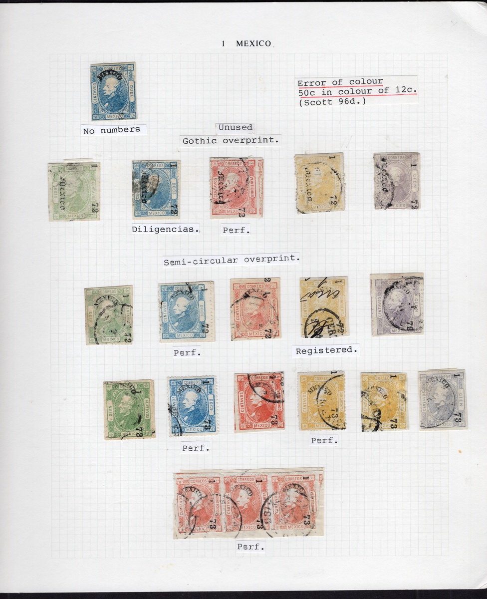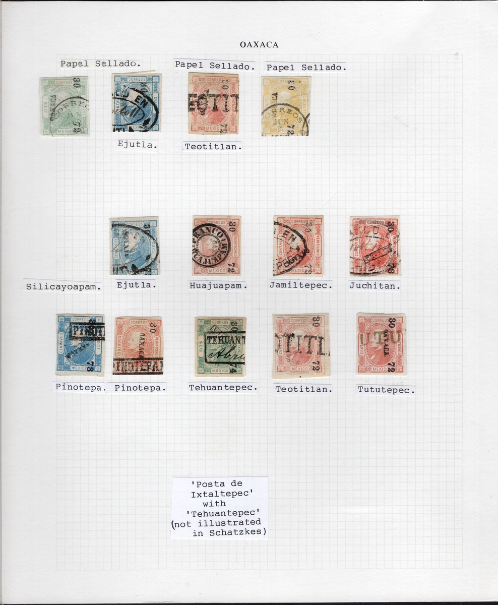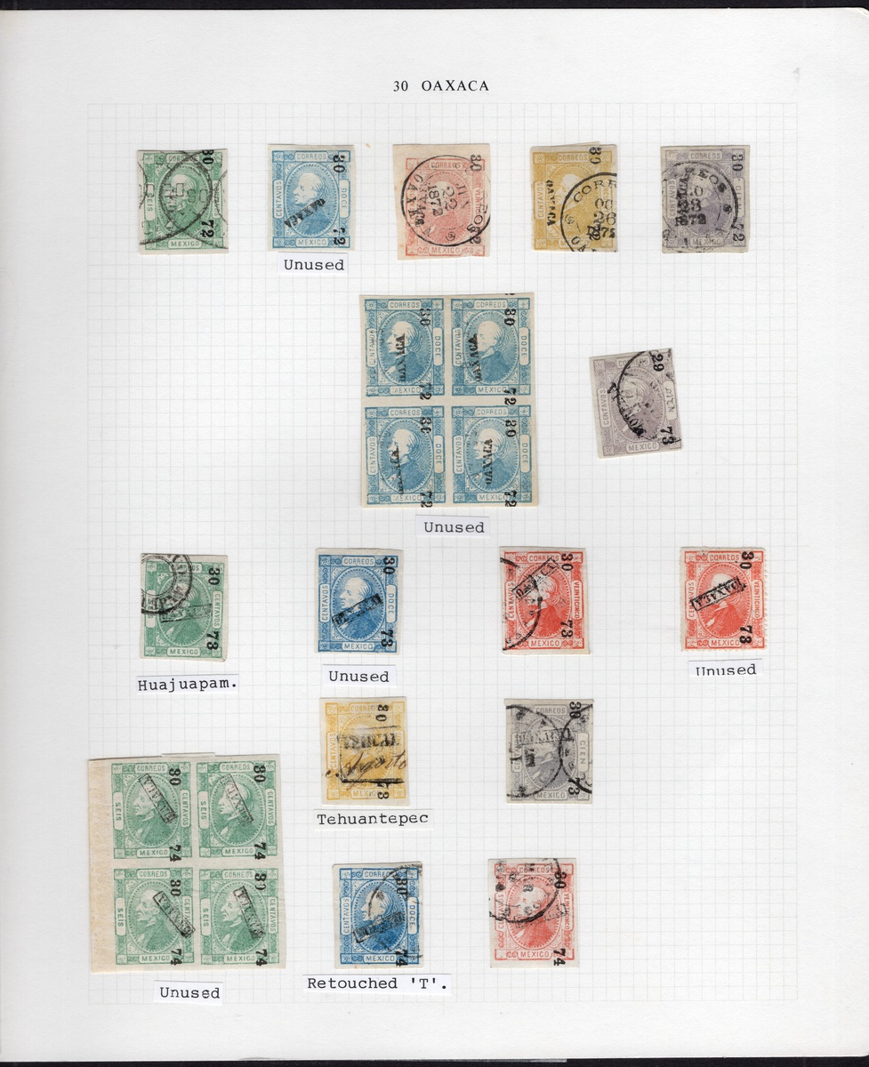 297 Used   imageMexico. 1872 "Hidalgos". Oaxaca group of 35 imperforate stamps, mostly used, along with a 25c. Red cover, neatly mounted on presentation pages (consignment #30), with different consignment years 1872-74 each in a row, with no duplication.. The collection includes denominations from 6c. to 100c., as well as four stamps with the "Papel Sellado" watermark. Many stamps feature cancellations from Oaxaca and its small towns, including Tehuantepec, Ejutla, Teotitlán, Huajuápam, Jamiltpec, Juchitán, Tututepec, Pinotepa, and others. Additionally, there are two attractive unused blocks of four: one of 6c. Green and one of 12c. Blue. The condition is generally good throughout, with many stamps having three or four clear margins. Scott 81-84, 93-96, 98; NF and Scott (for watermarked stamps) is $1,614., , (Image) (Image2) (Image3) (All Images)