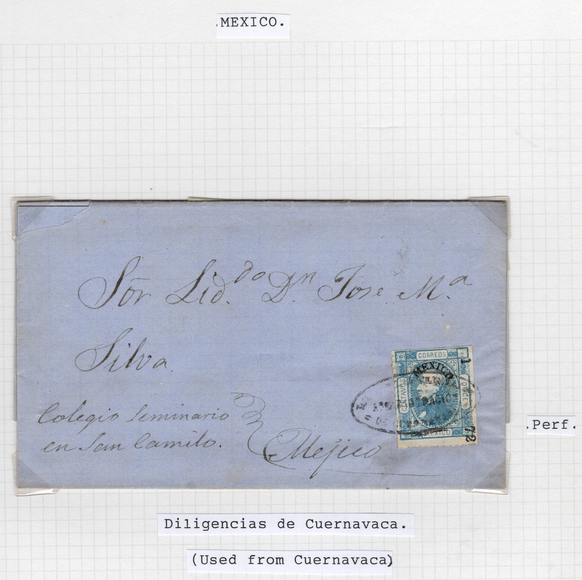 289 Used   imageMexico. 1872 "Hidalgos". Mexico District Assembly comprising 41 mainly perforated stamps and three covers (incl. one with a rare "Diligencias de Cuernavaca" h.s.). The stamps, largely used, are neatly mounted on presentation pages (consignment 1) with different consignment years (1872–74) and without duplication. This display includes all denominations from 6c. to 100c., as well as eight examples bearing the "Papel Sellado" or "La Croix Frères" watermarks. Both Gothic and semicircular overprints are represented, along with a scarce 13c. Blue showing no consignment numbers. Notable cancels include "Certificado" and "B" (buzón/drop mailbox), and there is a consignment error "37" for "73". In predominantly very fine condition, mainly showing good margins. Scott 83, 84, 87a, 88, 88a, 89, 89a, 92, 94 var, 95, 96, 98, 99-102, 104; NF and Scott (for watermarked stamps) is $ 6,073 for stamps off-cover., , (Image) (Image2) (Image3) (Image4) (All Images)