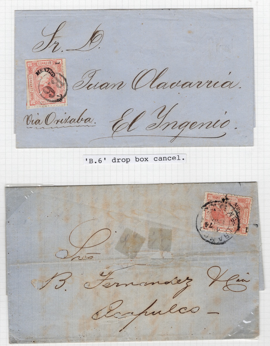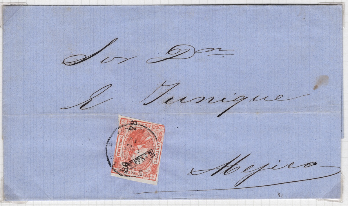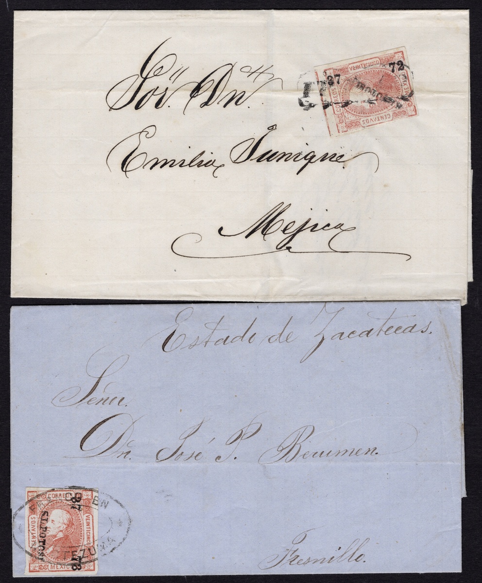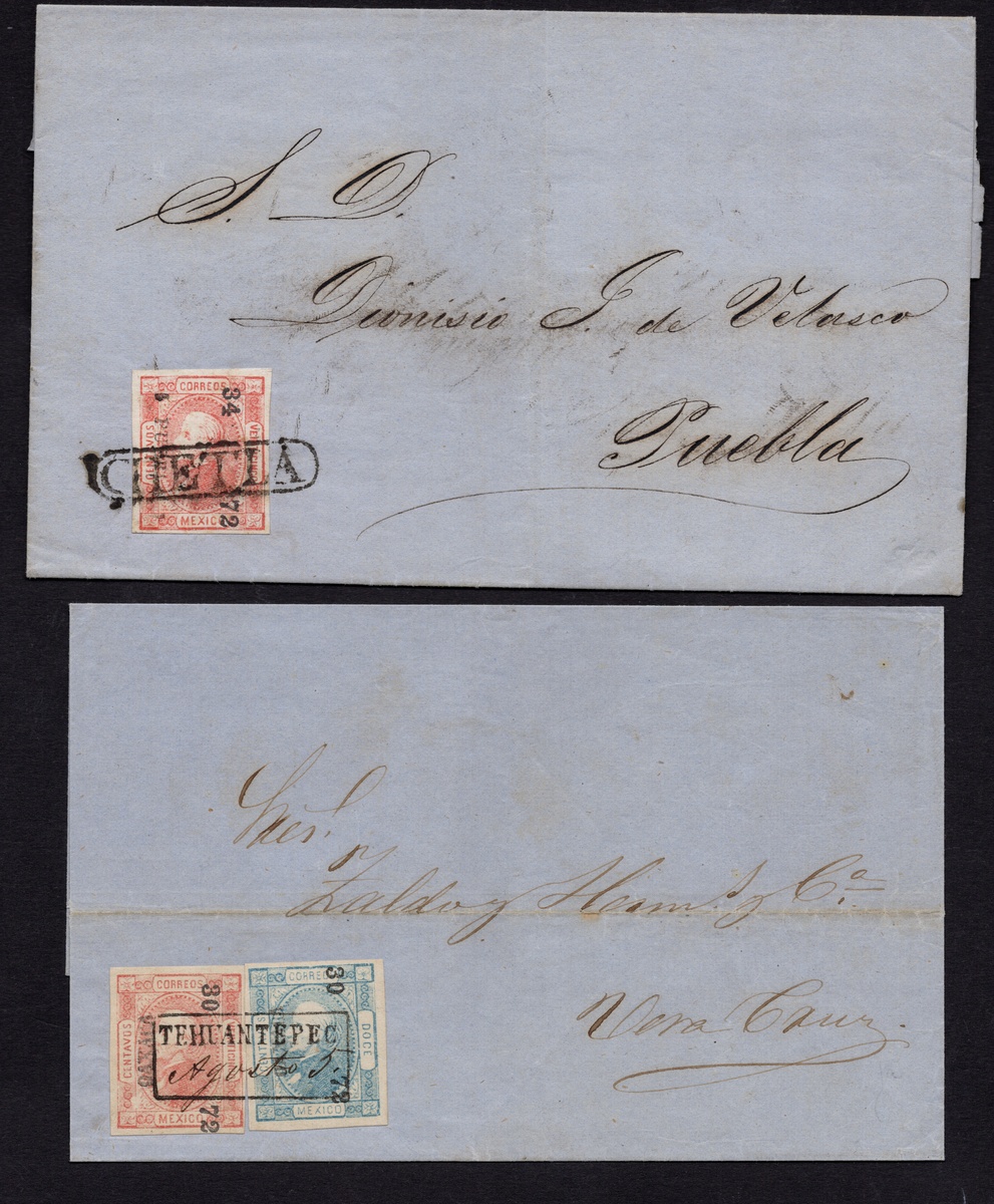 298   imageMexico. 1872 "Hidalgos". Oaxaca, Puebla Two covers originating from small towns bearing imperforate stamps, including one from Chietla (Puebla) to Puebla bearing 25c. Red imperforate (#34-72), tied by superb h.s. and dated July 29, 1872; the other cover sent from Tehuantepec (Oaxaca) to Veracruz with 12c. Blue and 25c. Red (#30-72), dated August 5, 1872 and untied by framed h.s but with matching docketing. Scott 94, 95. (Image)