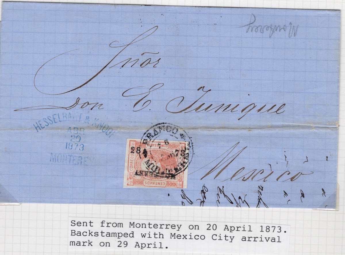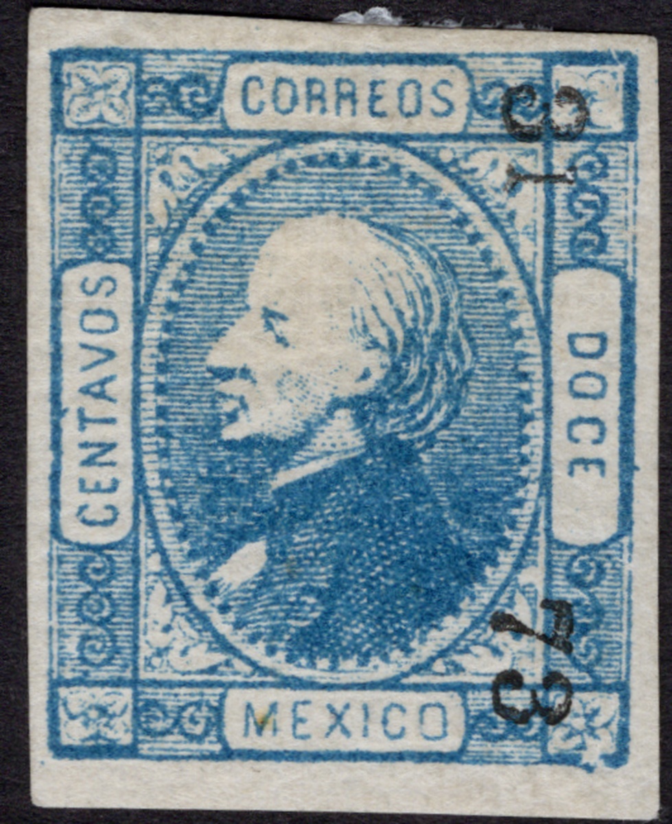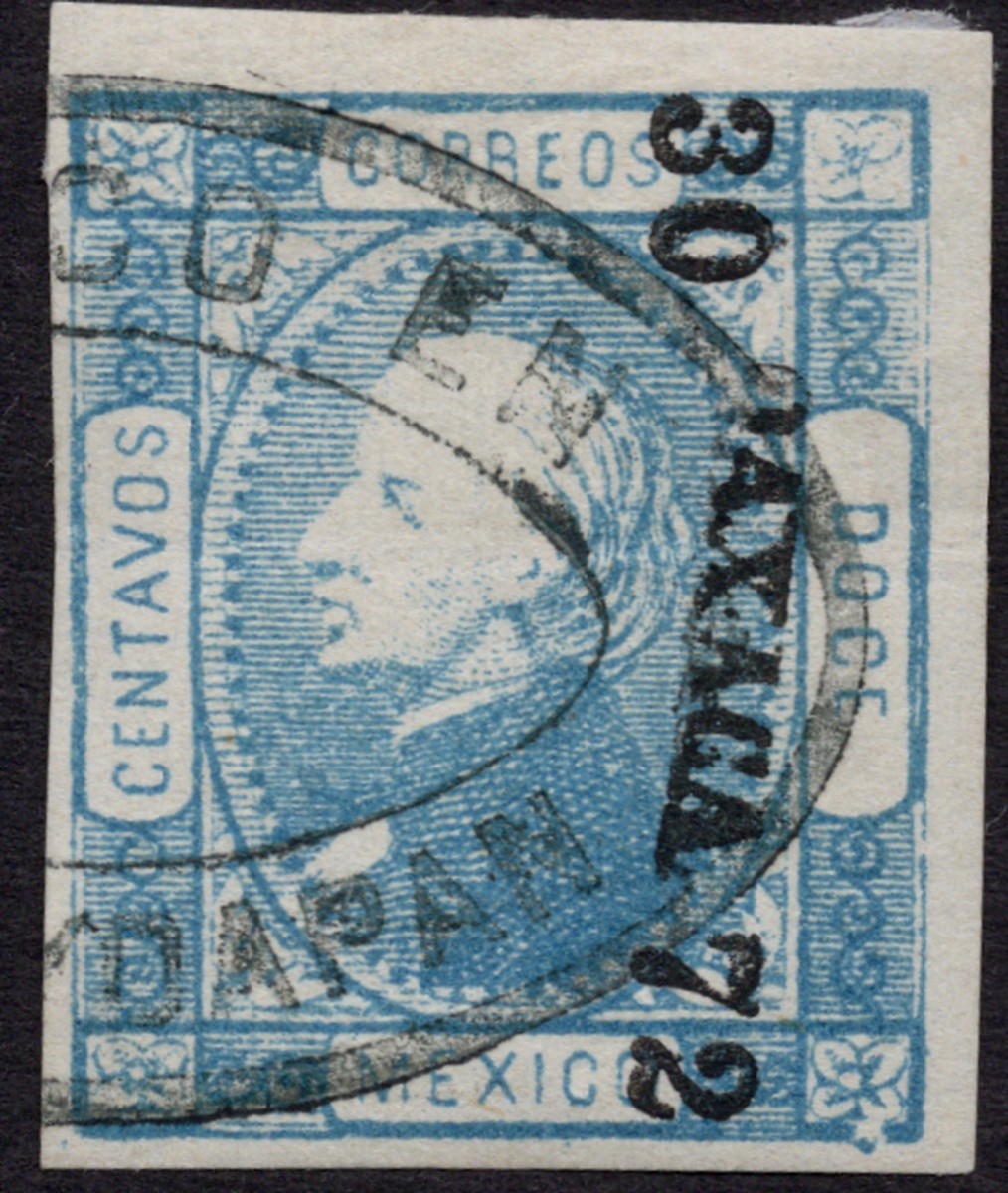 299 Used   imageMexico. 1872 "Hidalgos". Oaxaca, San Luis Potosí Group of two imperforate stamps from remote towns, along with two covers. The stamps include a 13c. Blue Oaxaca (#30-72), canceled in Silicayoapam, and a 25c. Red (#30-73), canceled in Posta de Ixtaltepec (not illustrated in Schatzkès). The covers feature a 25c. Red from San Luis Potosí (#37-72) and another from Moctezuma (#37-3). Scott 94, 95., (Image) (Image2) (Image3) (All Images)