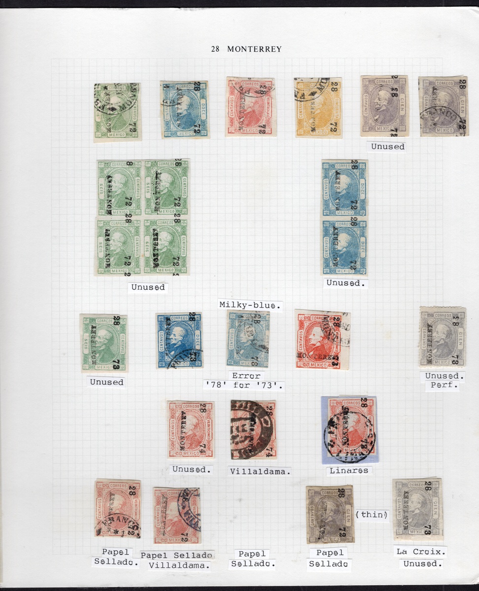 291 Used   imageMexico. 1872 "Hidalgos". Monterrey Group of 24 mostly used imperforate stamps and one cover, cleanly mounted on presentation pages (consignment #28) and featuring different consignment years (1872–74) arranged in rows, without duplication. All denominations are included, and three examples bearing the "Papel Sellado" watermark (the 100c., though defective, is a rare stamp). Also displayed one 100c. labeled as having the "La Croix Frères" watermark, which may or may not be present (thus counted as unwatermarked). Notable cancels include Villaldama, Linares, and Monterrey. Generally in very fine condition. Scott 82-83,86, 93-96, 98; NF and Scott (for watermarked stamps) is $1,334 for stamps off cover., , (Image) (Image2) (All Images)