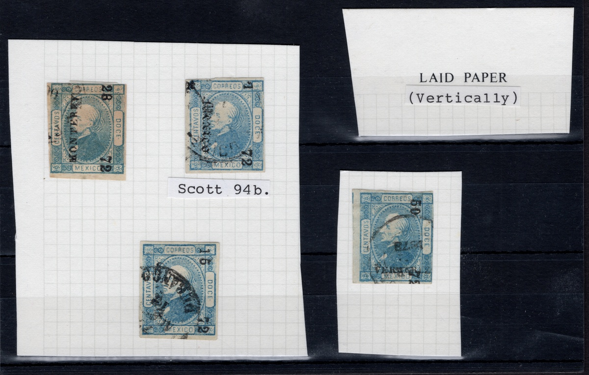 292 Used   imageMexico. 1872 "Hidalgos". Monterrey, Mexico, Veracruz, Durango Group of four 12c. Blue (#1, 15, 28, 50-72) on vertically laid paper, used, showing two clear margins and one or two being close or touching. All scarce. Scott 94b, $840. (Image)