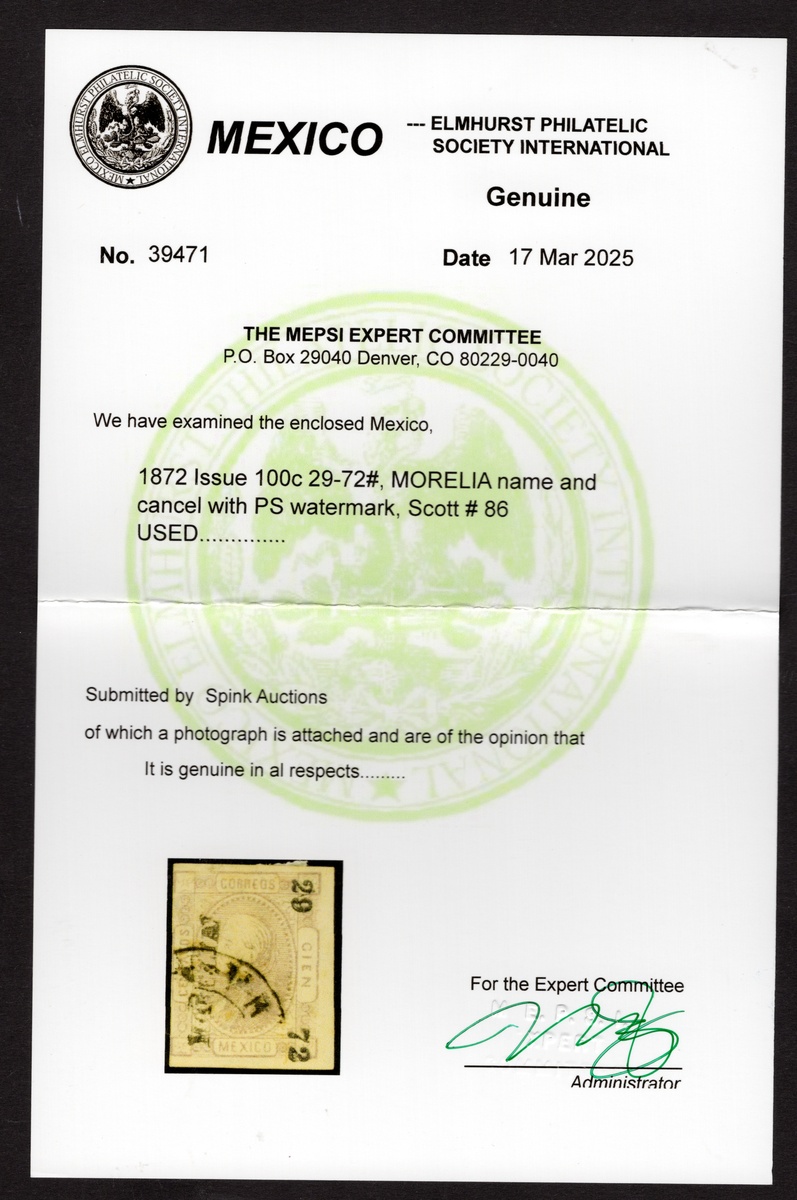 293 Used   imageMexico. 1872 "Hidalgos". Morelia 100c. Gray Lilac (#29-72), imperforate used with c.d.s. and possessing "Papel Sellado" watermark, just cut into at left, otherwise good margins. 2025 MEPSI certificate. Scott 86, $650. (Image) (Image2) (All Images)