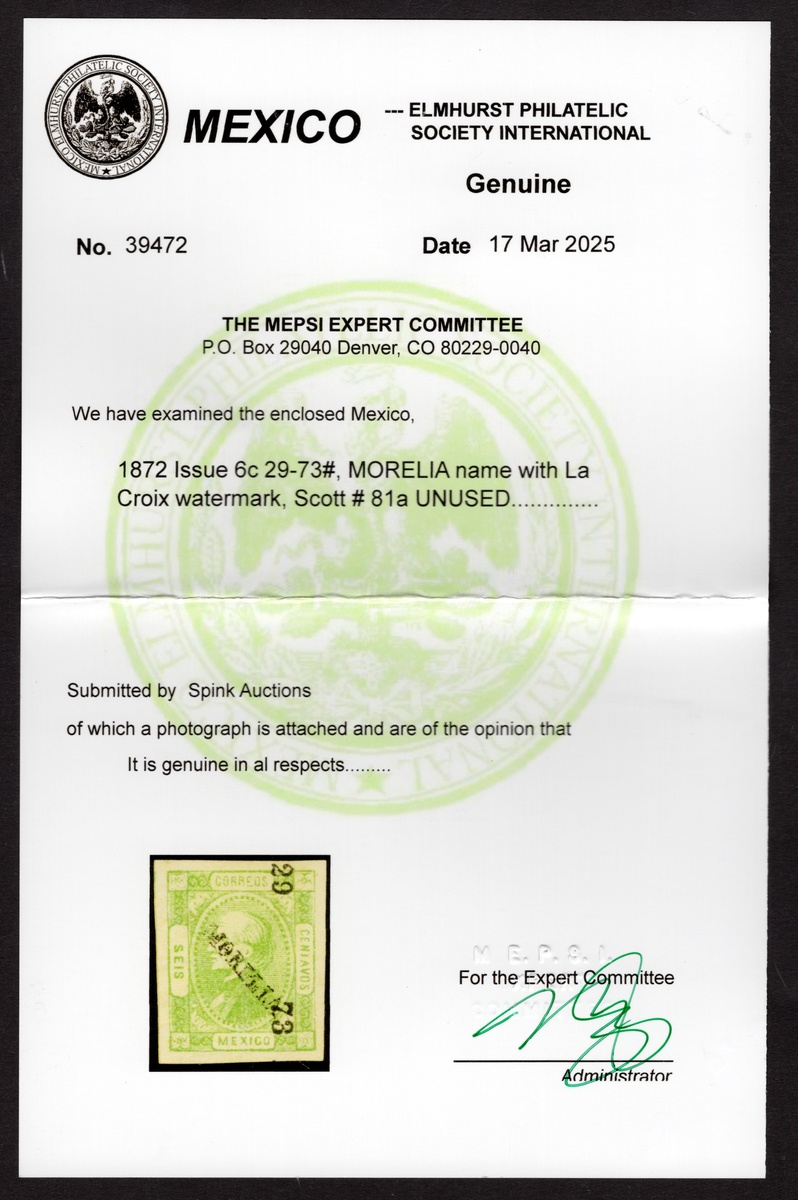 295   imageMexico. 1872 "Hidalgos". Morelia 6c. Green (#29-1873), imperforate unused with "La Croix Frères" watermark, margins all around. 2025 MEPSI certificate. Scott 81a, $2,000. (Image) (Image2) (All Images)