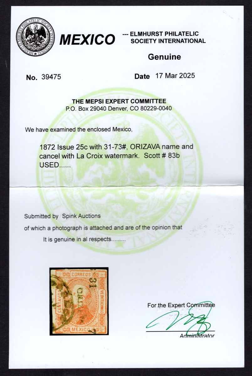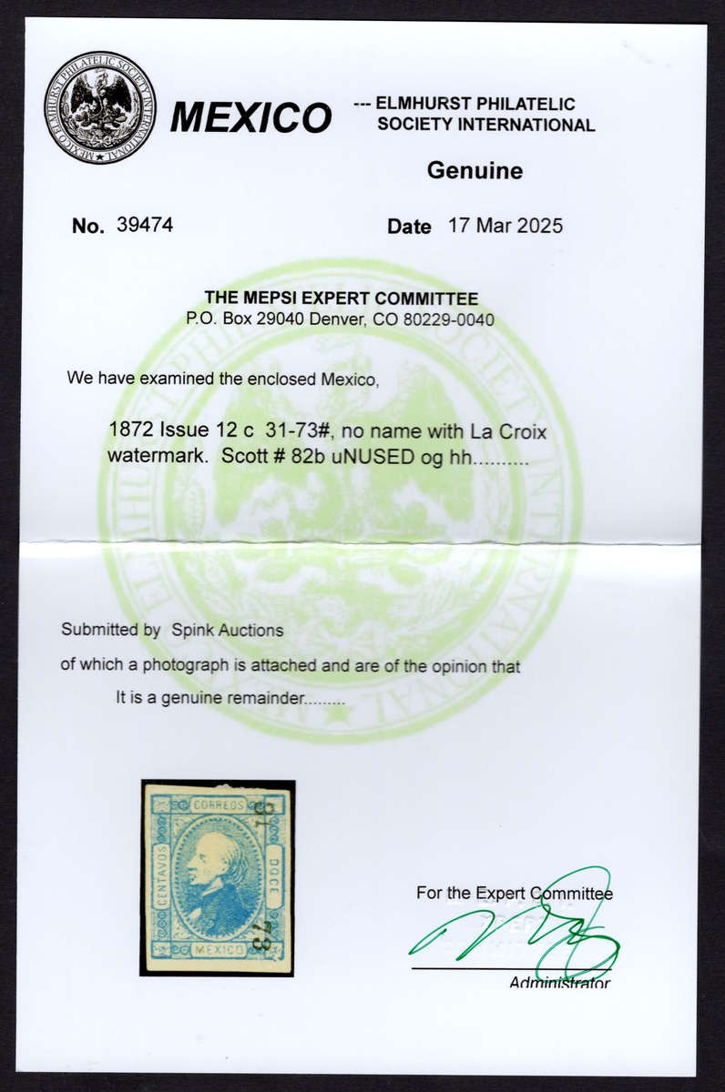 300 Used   imageMexico. 1872 "Hidalgos". Orizaba 12c. Blue and 25c. Red (#31-1873), imperforate with "La Croix Frères" watermark. The 12c. is an unused reminder bearing margins all around and o.g. The 25c. is used with tight margins. Both have 2025 MEPSI certificates. Scott 82b and 83b, $1,025., (Image) (Image2) (Image3) (Image4) (All Images)